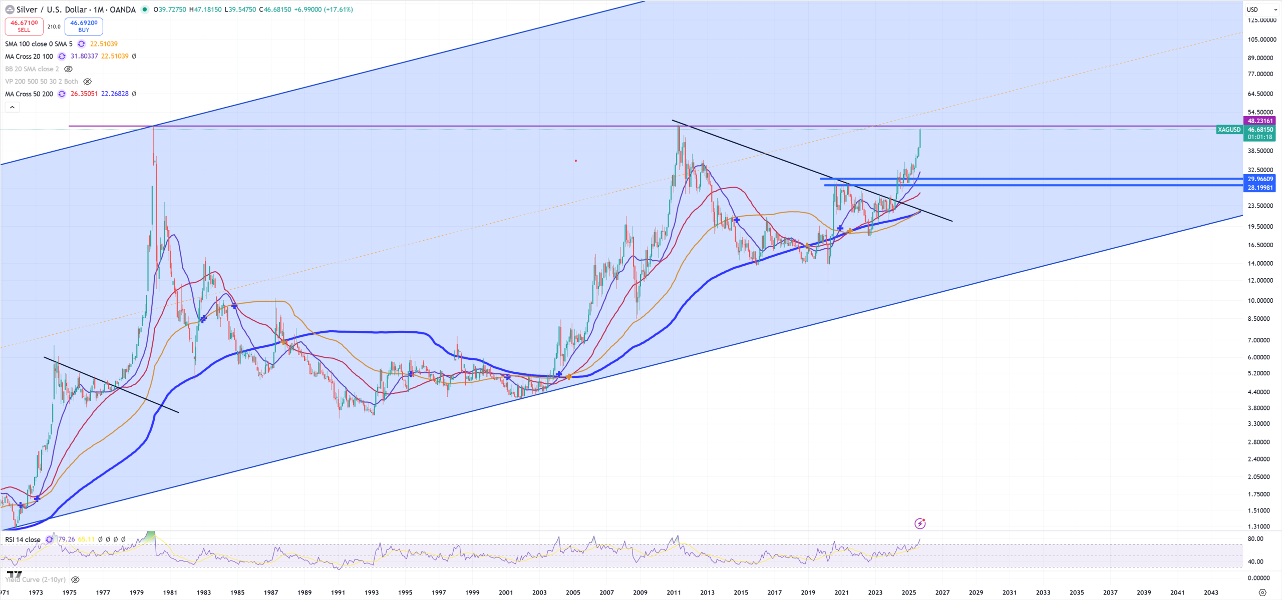 XAUUSD – is gold a bubble? Without a doubt (M)RSI is the most overbought since 1980, but in 1980 distance from peak to (M)MA50 was -75% (big “tulip bubble”) today it’s just -41%. To get to the same distance to (M)MA50 which used to be in 1980 we need to be fast in 6500$ level, which is exactly middle point of the upper channel (above 1980-2011 TREND) with upper level around 15000$