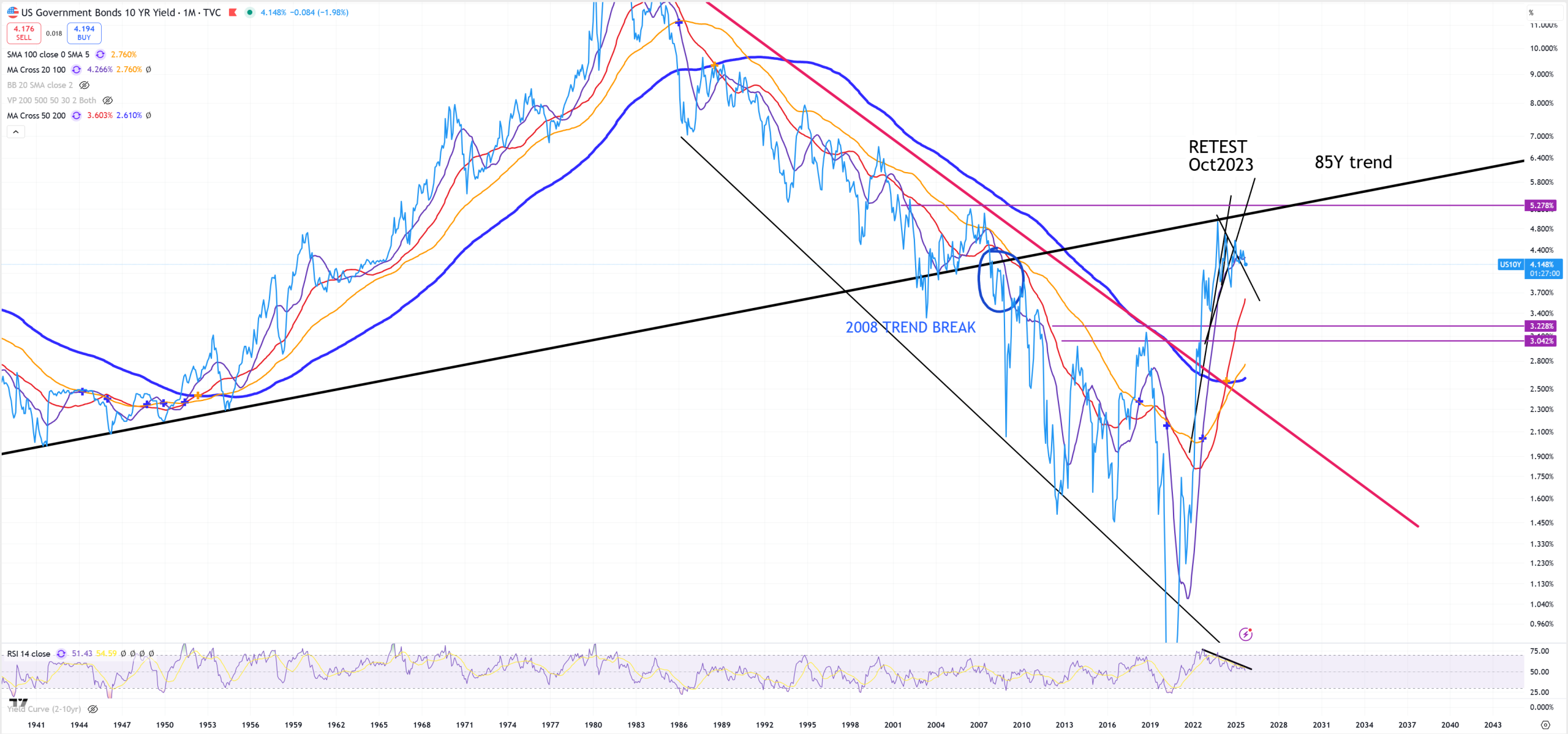 US10Y – line chart and October 2023 still acts as the last point of retest. Many saying we’ll break it higher, I think US will suck liqudity from the world to sponsor their debt.