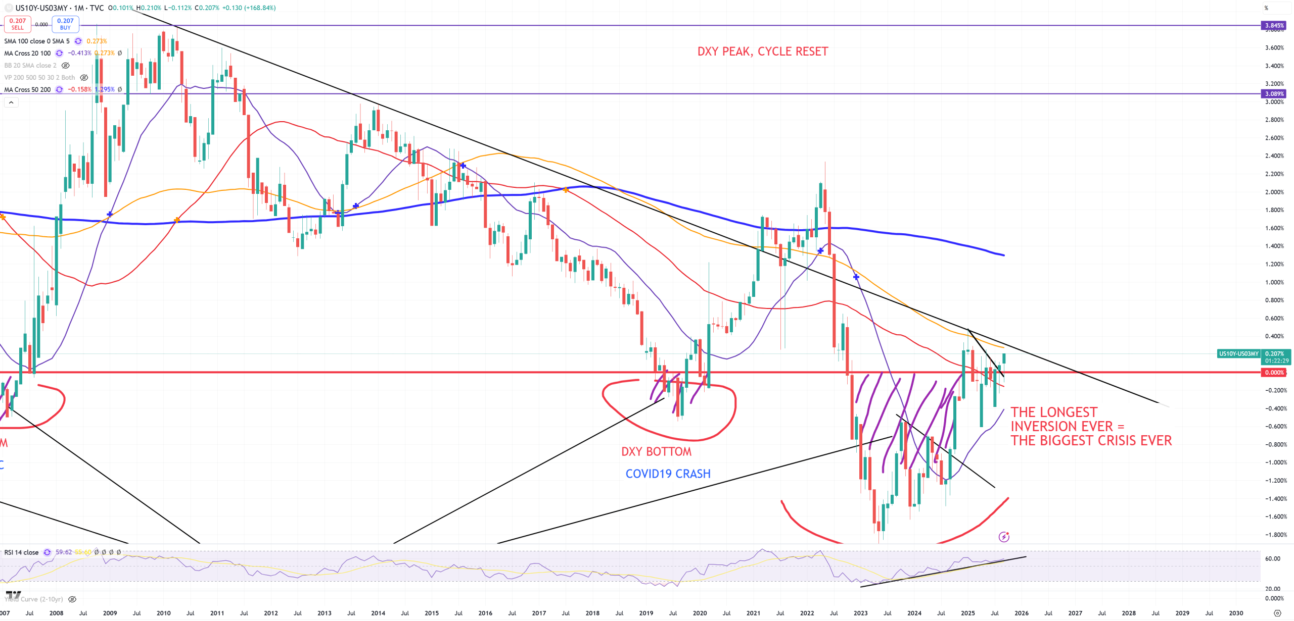 US10Y/US03MY – 1100 days of inversion or around inversion, previous record belonged to 1929 maybe soon will be doubled (700 days). Just +20bps – nothing happens to be interested in this spread. Until +50-60bps nothing is going to happen. This spread still proves that we’re on the same 2009+ cycle with the biggest rescue around 2022 when from +2.2% we managed to crash to -2.0%. Gravity still building.