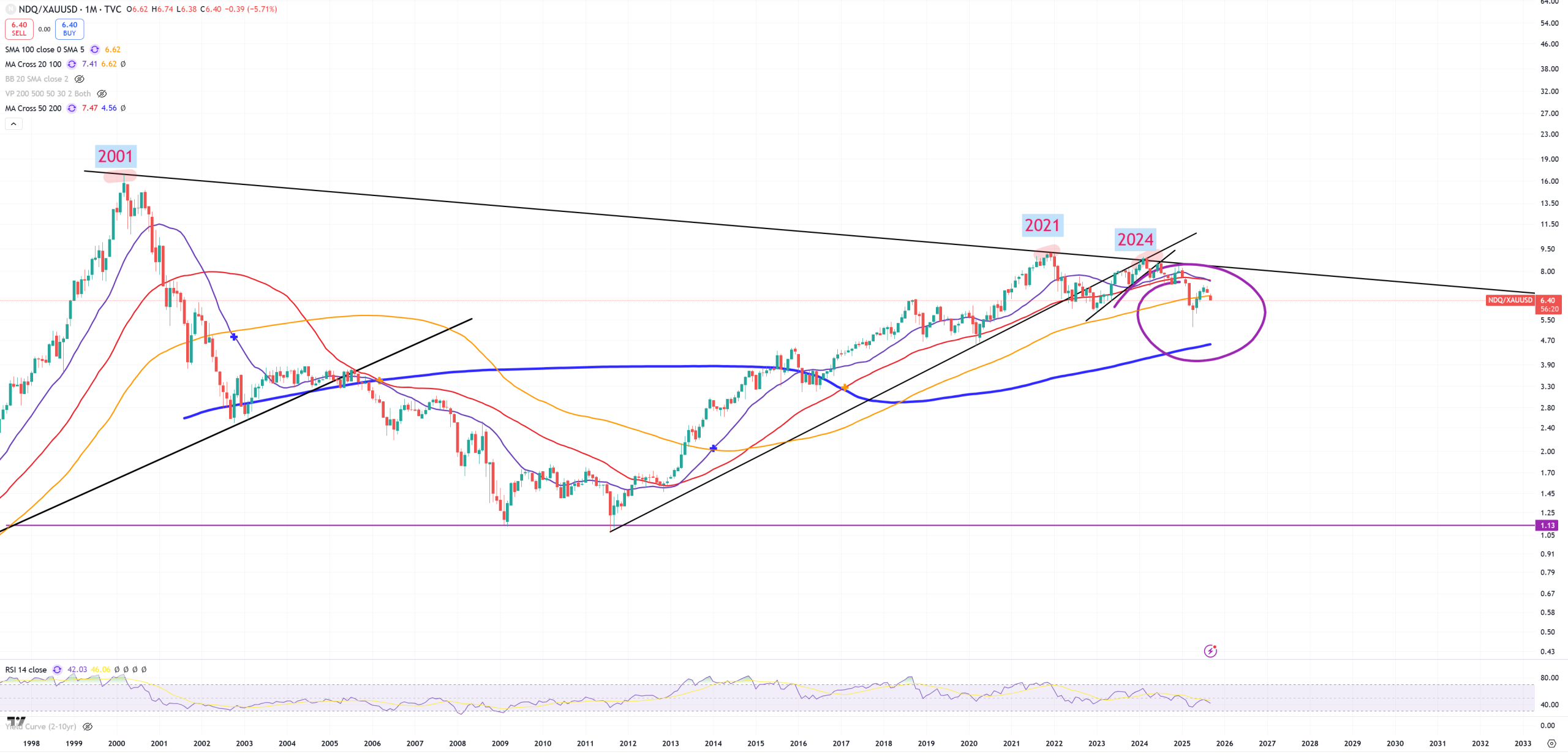 NDQ/GOLD – not surprising chart also should how gold outperforms Nasdaq 100, and yellow (M)MA100 did not give up this month.