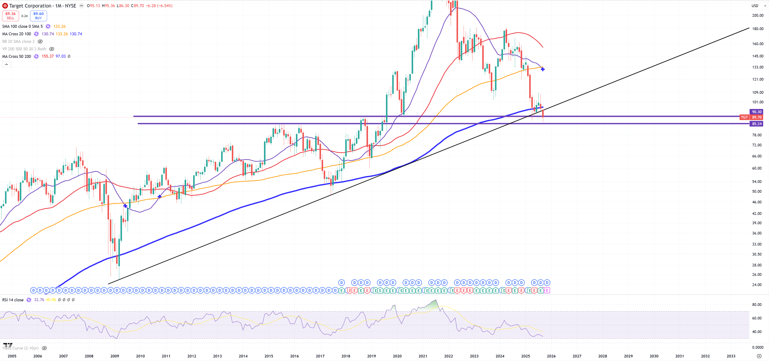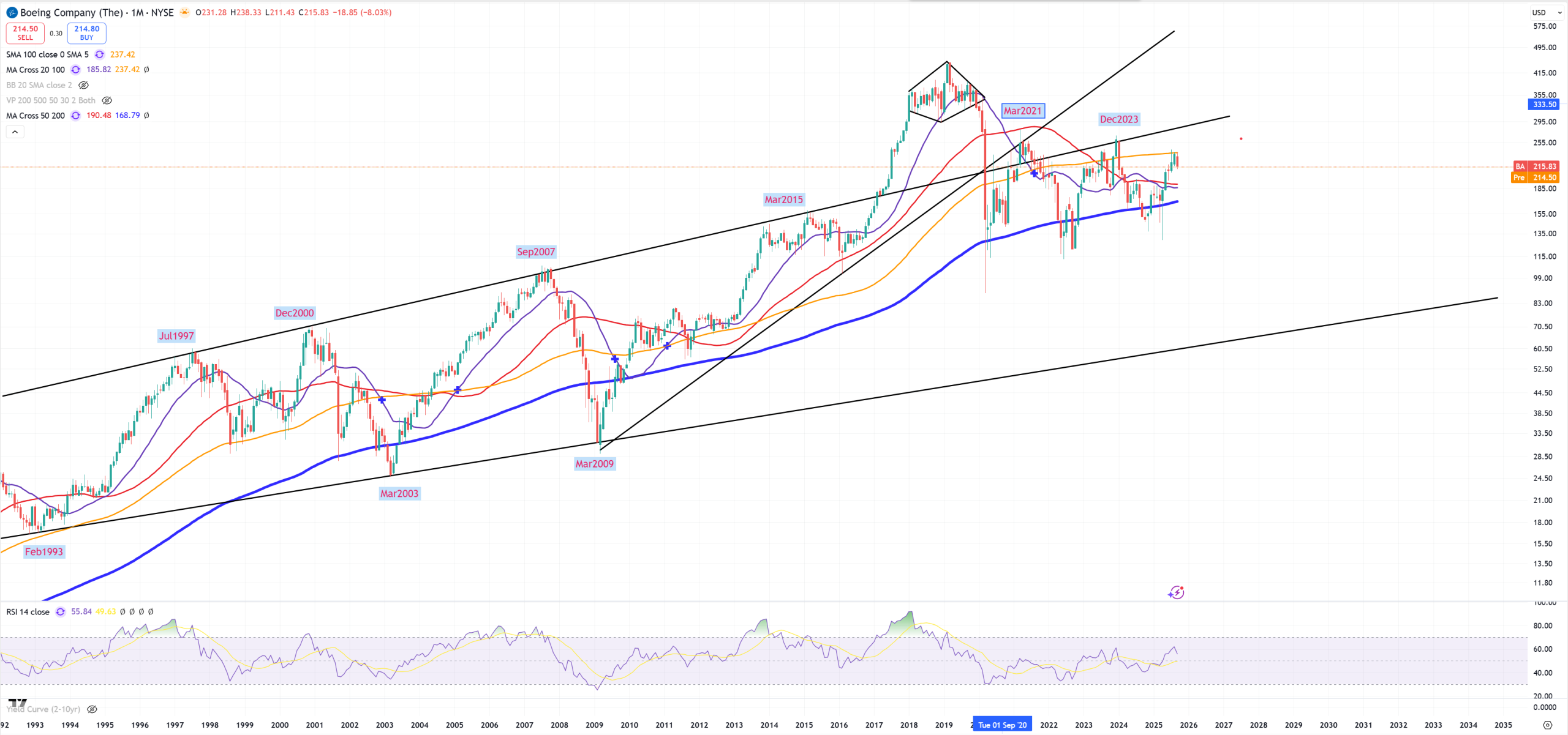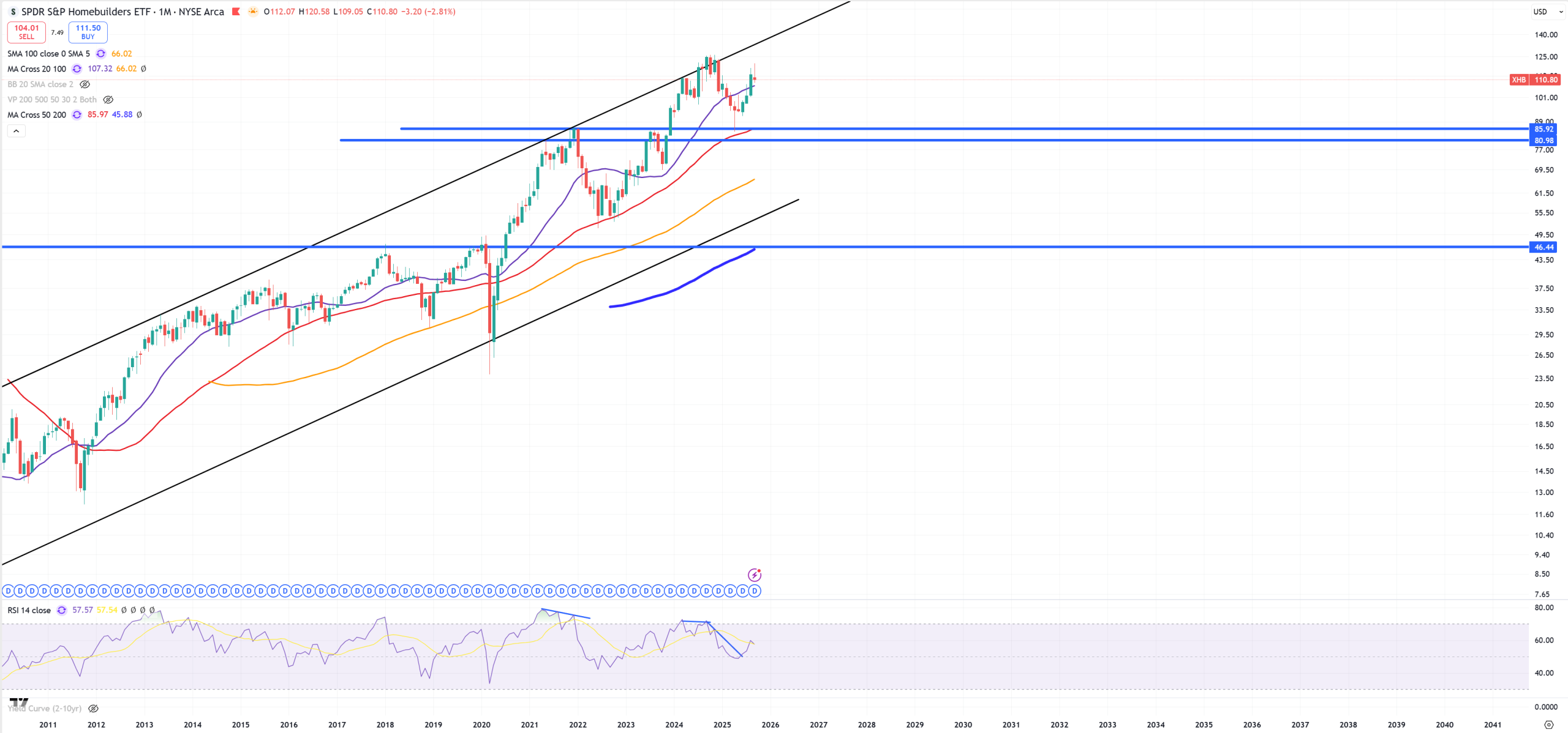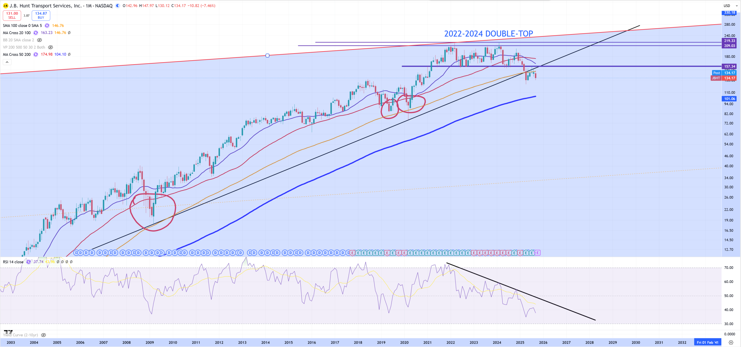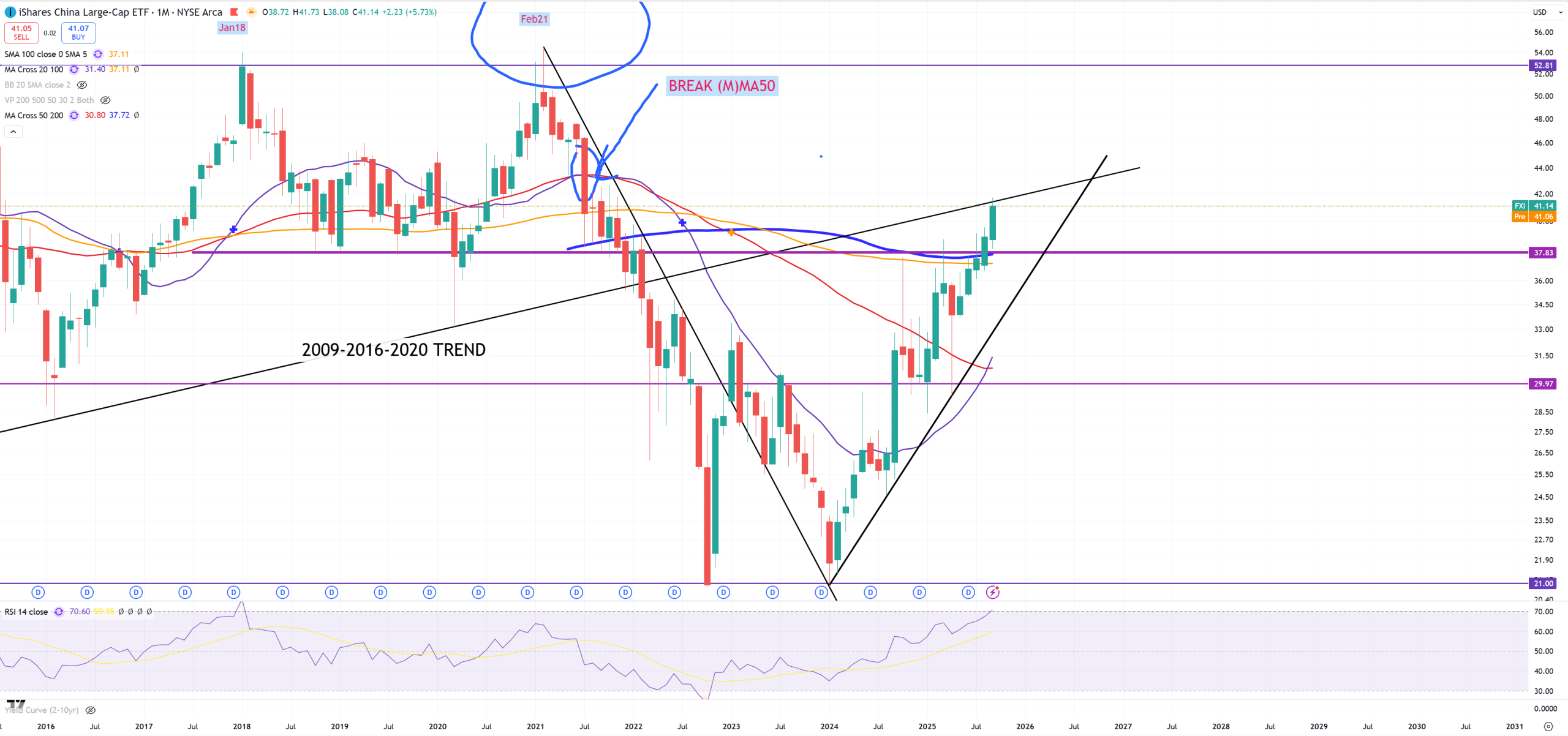 BA – I love Boeing chart because (M)MA200 break was so far always a confirmation of entering into a bear market of the whole economy. It was rescued 3 times so far from blue (M)MA200 : 2020, 2022, 2024/2025. Now (M)MA100 so testing natural bull-trap as yellow (M)MA100 is above red (M)MA50. Lower trend is still 60$. Also no 10Y/3M uninversion no drop.