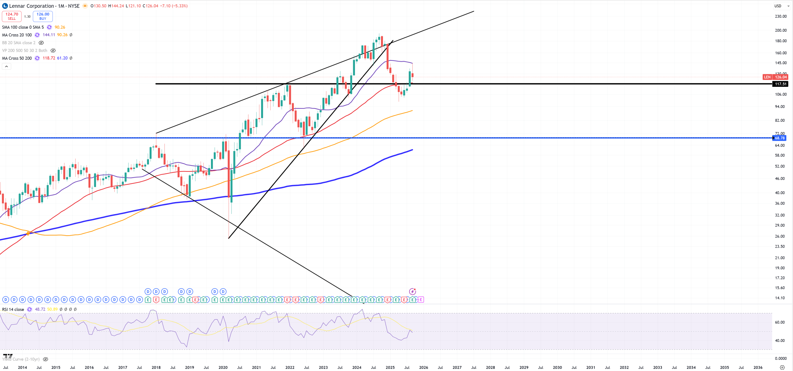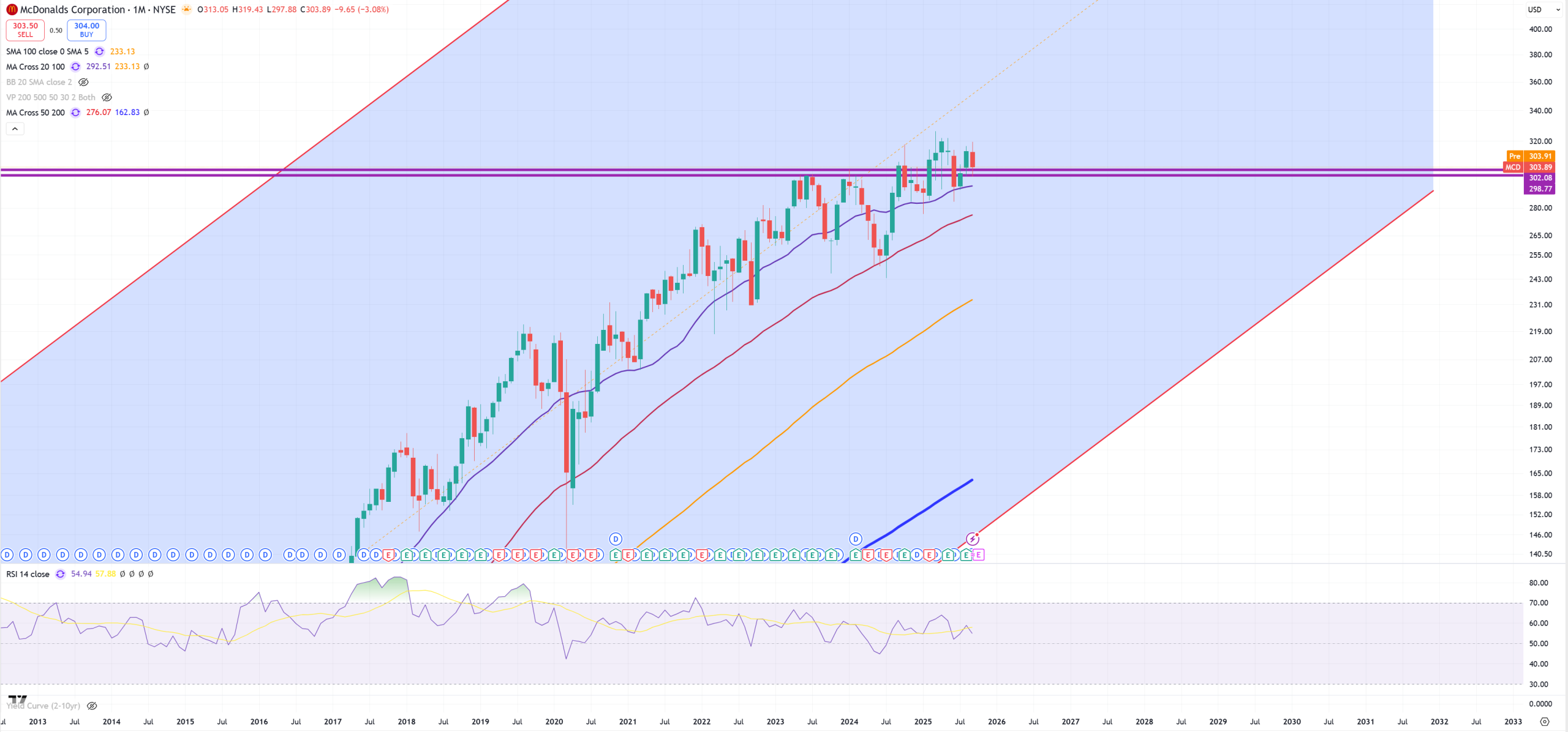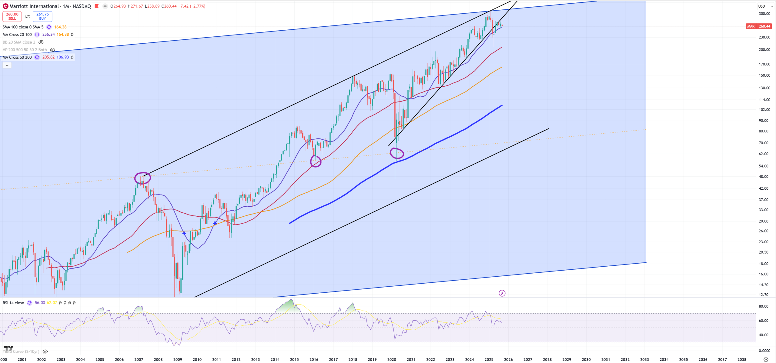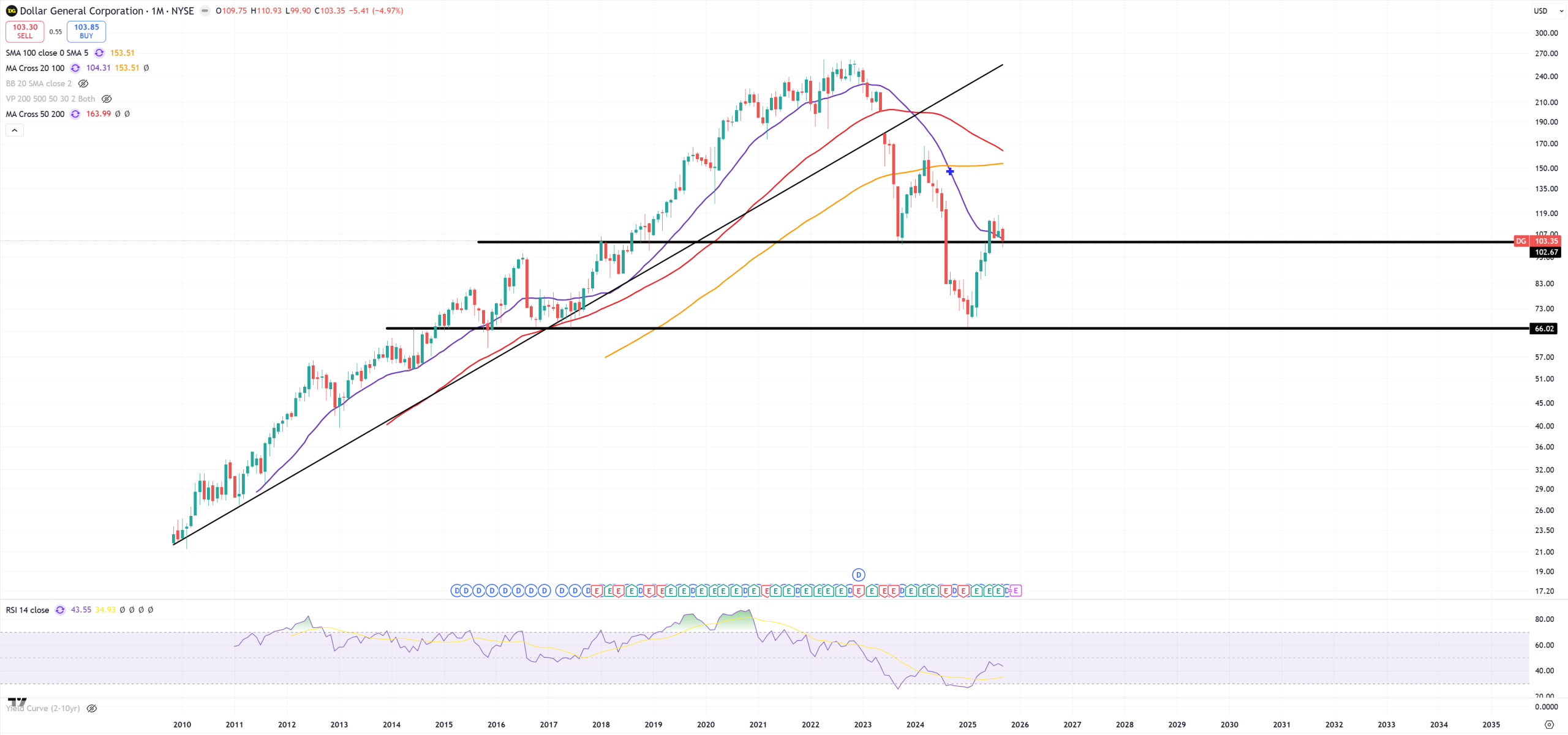 BA – I love Boeing chart because (M)MA200 break was so far always a confirmation of entering into a bear market of the whole economy. It was rescued 3 times so far from blue (M)MA200 : 2020, 2022, 2024/2025. Now (M)MA100 so testing natural bull-trap as yellow (M)MA100 is above red (M)MA50. Lower trend is still 60$. Also no 10Y/3M uninversion no drop.