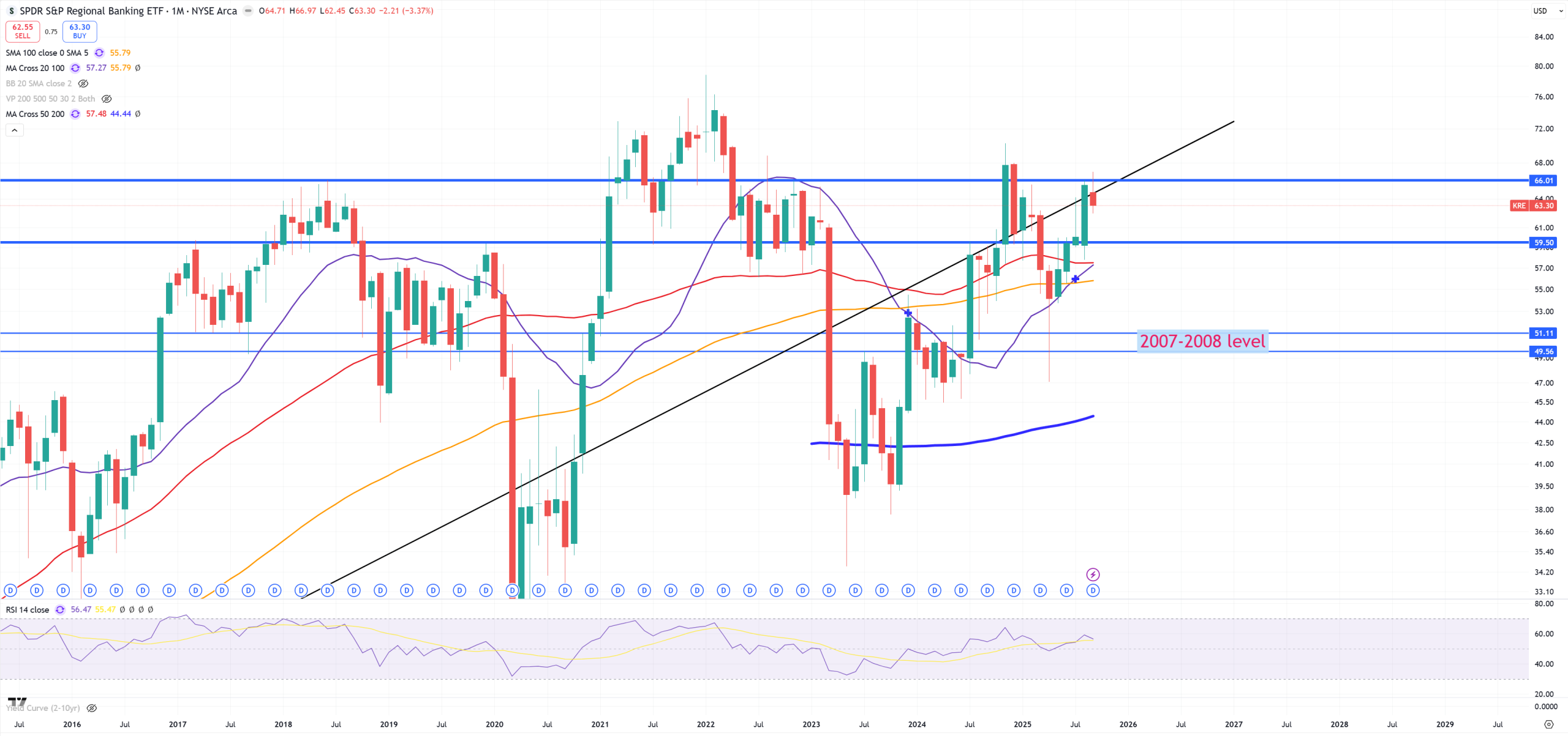 KRE – Regional Banks are great example how market doesn’t want to stick to key pattern/trend, but sofar it always lands below it with small spikes above.