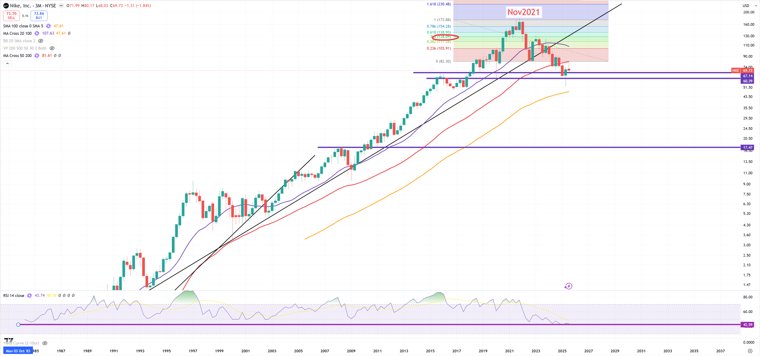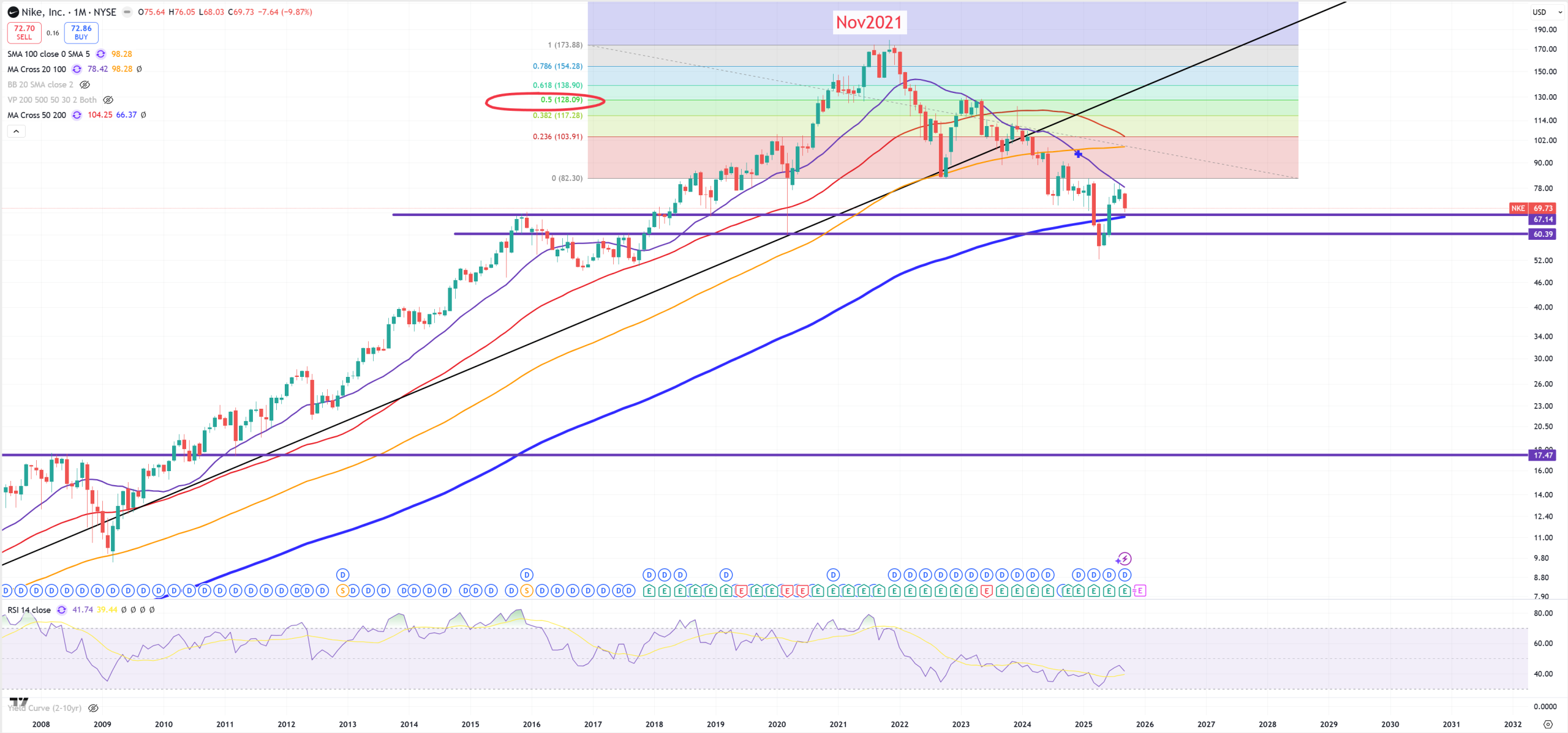 NKE – first chart on (M) second on (3M) – take a look that on (3M) NKE has never broken (3M)MA50 and has never been so low on (3M)RSI. You can tell it’s a bottom, or you can tell seeing 10Y/3M inverted for 1100 days it’s a big long term turn.