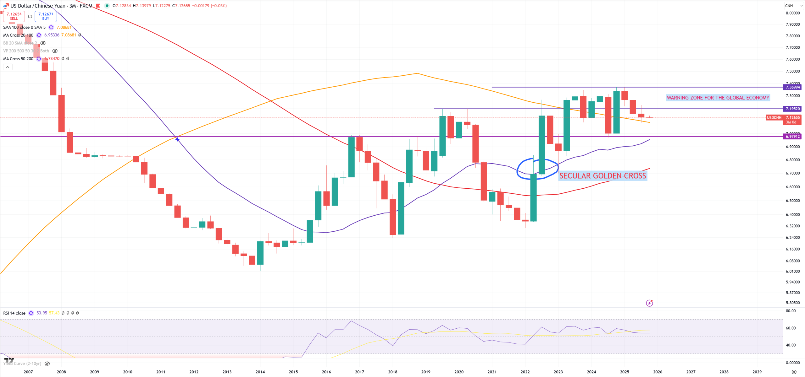 USDCNH – as I’ve been saying the power of the $$$ is a weakness of the Yuan – hard to see any level of support here when DXY sits on multiple support levels, unless you turn the chart into 3M view and you see yellow (3M)MA100 around 7.12. This USDCNH move from 7.40+ to 7.12 cost DXY a drop from 110 to 96.