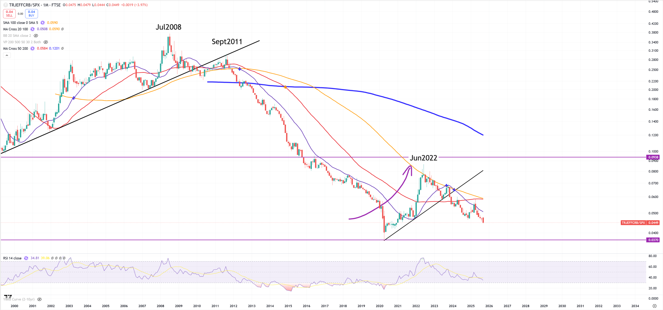 CRB/SPX – it tells us peak of inflation was around Jul2008 later bounce till September 2011 and downturn. Big inflationary spike from 2020 till Jun2022 and downturn, soon retest of 2020 lows.