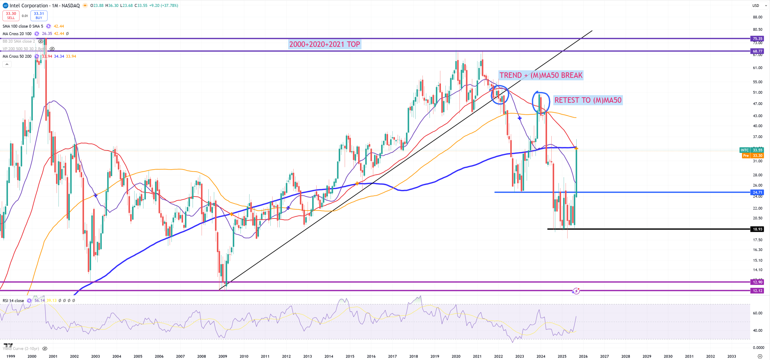 INTC – Intel – managed to get out from 19-25$ consolidation to the upside and now hitting into secular death-cross moment (M)MA50 & (M)MA200 resistance