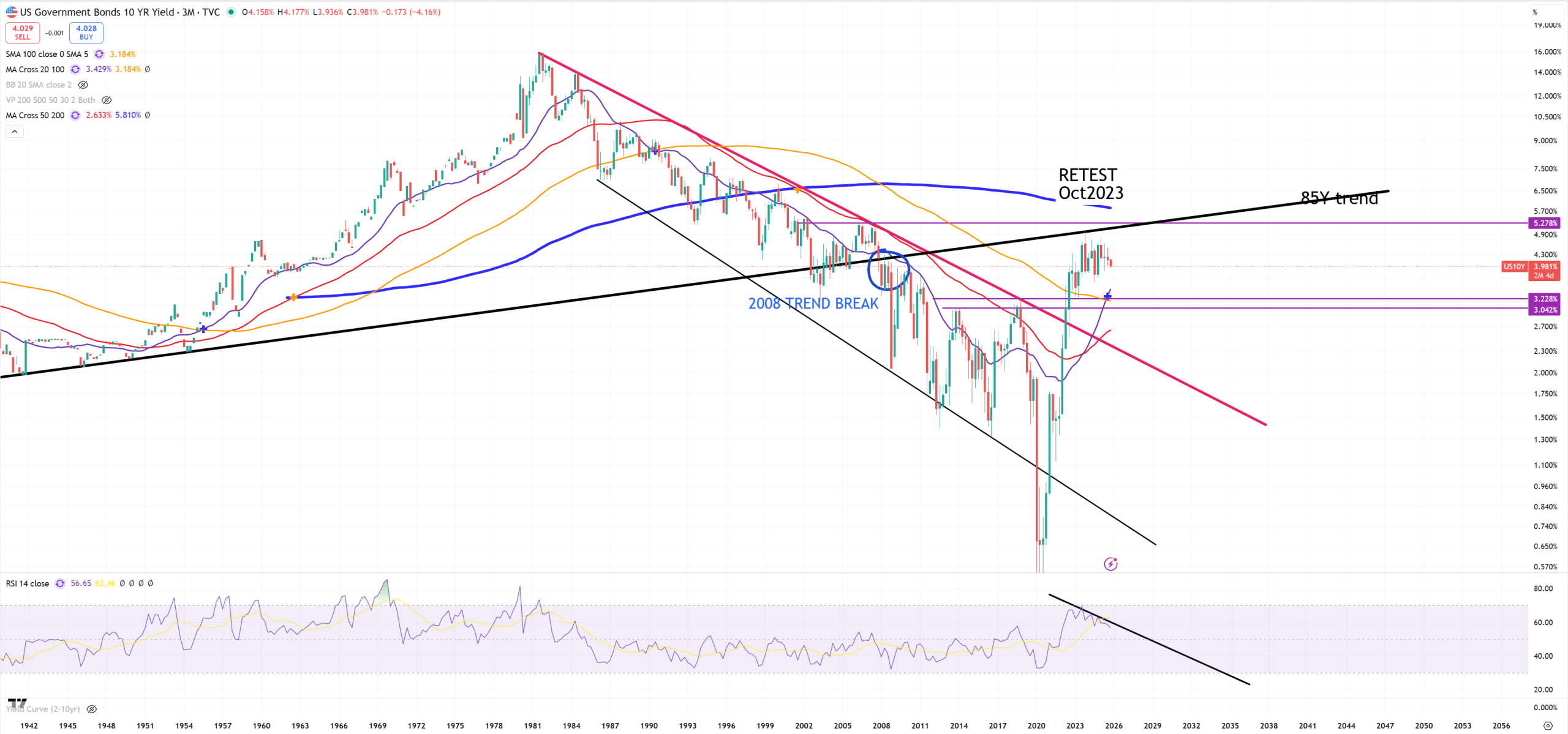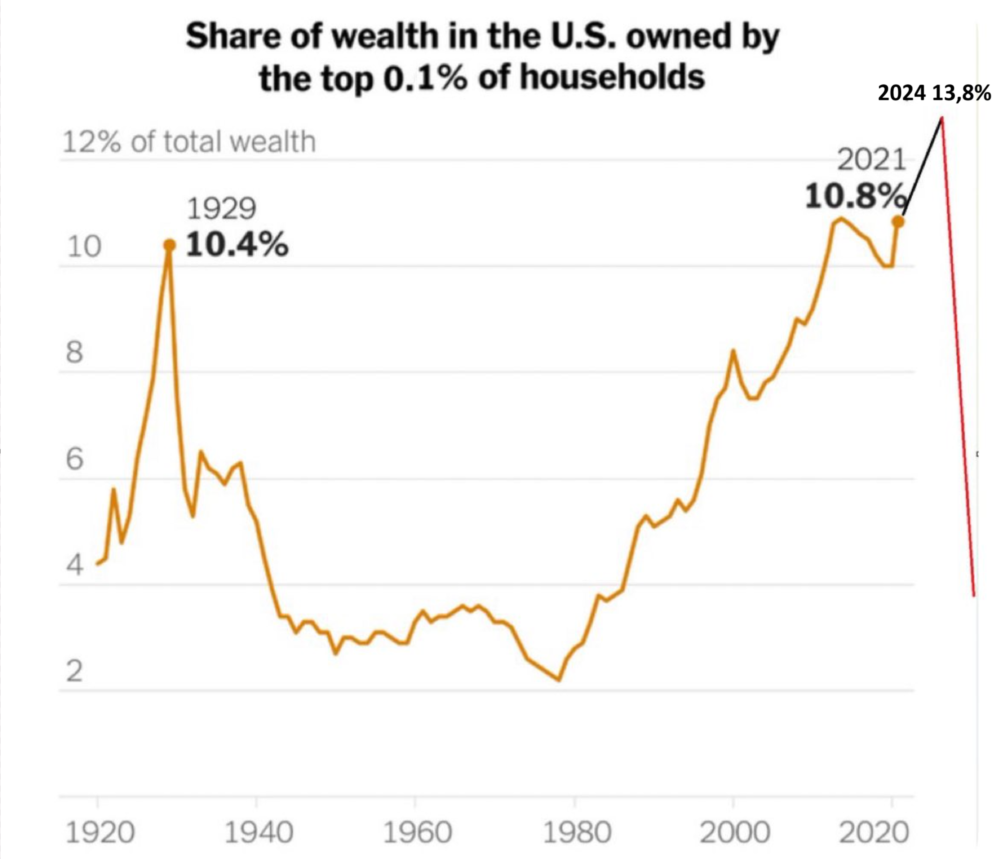 But this US10Y retest in October 2023 is super important, because if it is just a retest to trend break. It means the move down in yields will be biblical telling us this artificial spike of inflation was just “an epic spike of inflation” still in the same disinflationary cycle which in reality moved wealth to top 0.1% from 10% in 2020 to almost 14% in 4Q24 -> that’s how inflationary spikes work in disinflationary cycles.
