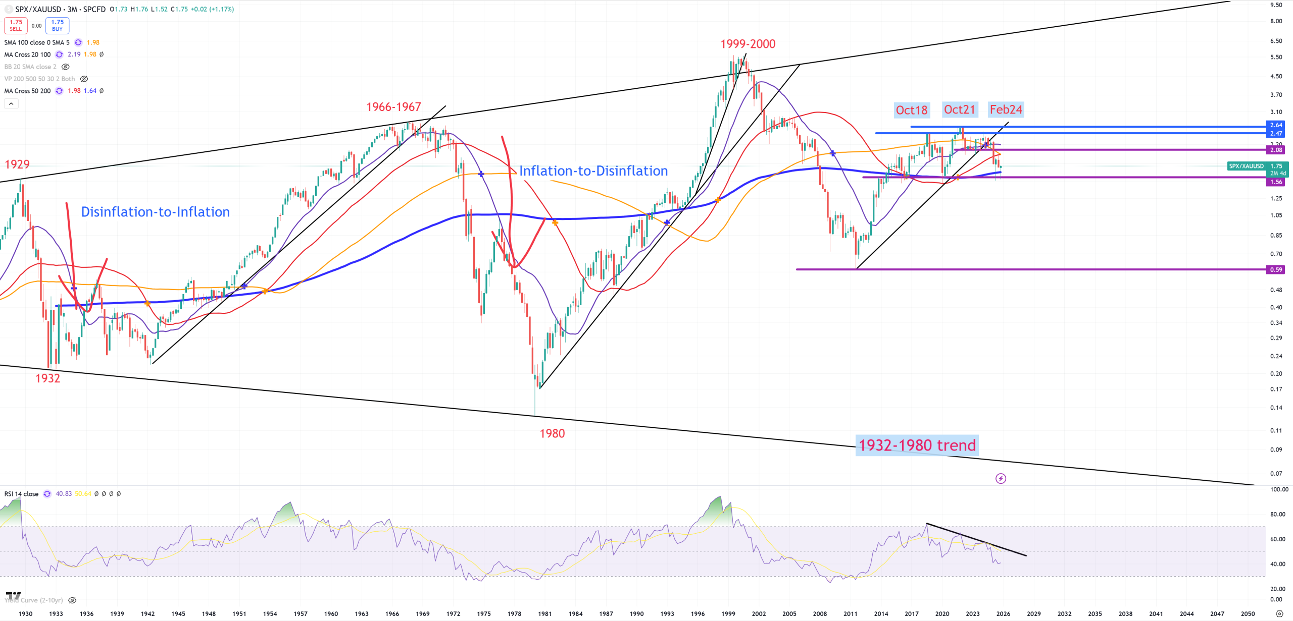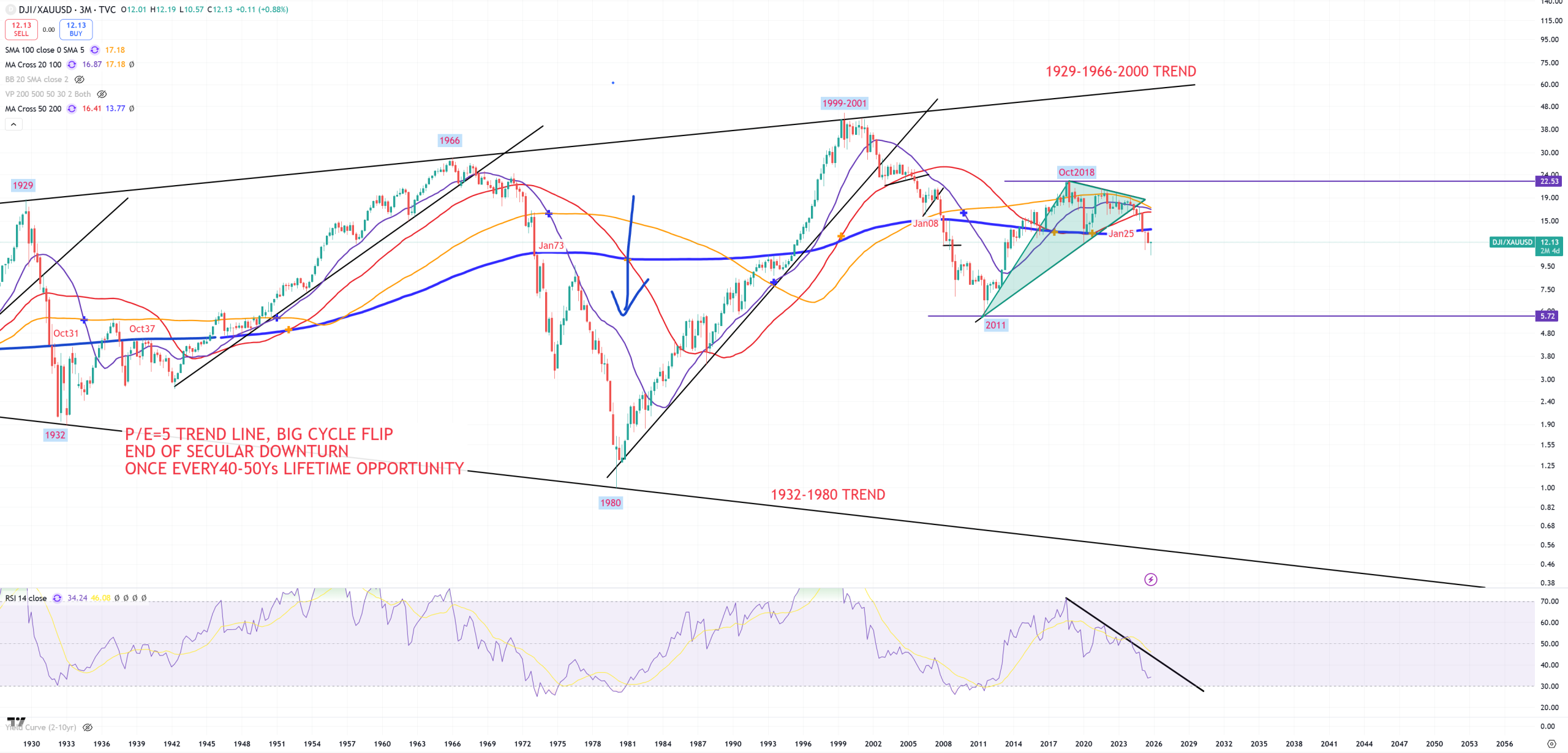 DJI/GOLD – I prefer DJI vs SP500 because of two reasons. First : DJI in most cases doesn’t have the biggest bubbles in its index. Second : it has a bit better technical pattern than SPX/GOLD. We clearly see here the economy made a cycle peak in 2018. It’s also worth to mention this blue (3M)MA200, as it turns out it’s the most important MA in long term cycles which determines big cycle changes. It was broken so far couple times down : 1931, 1937, 1973, 2008, 2025.