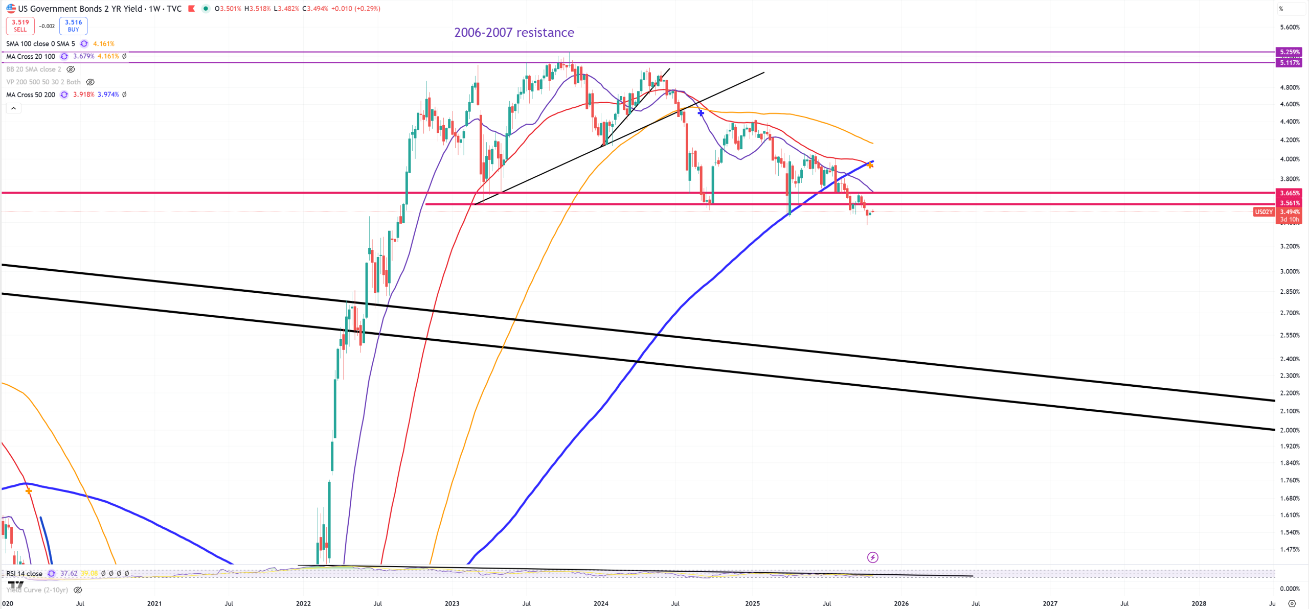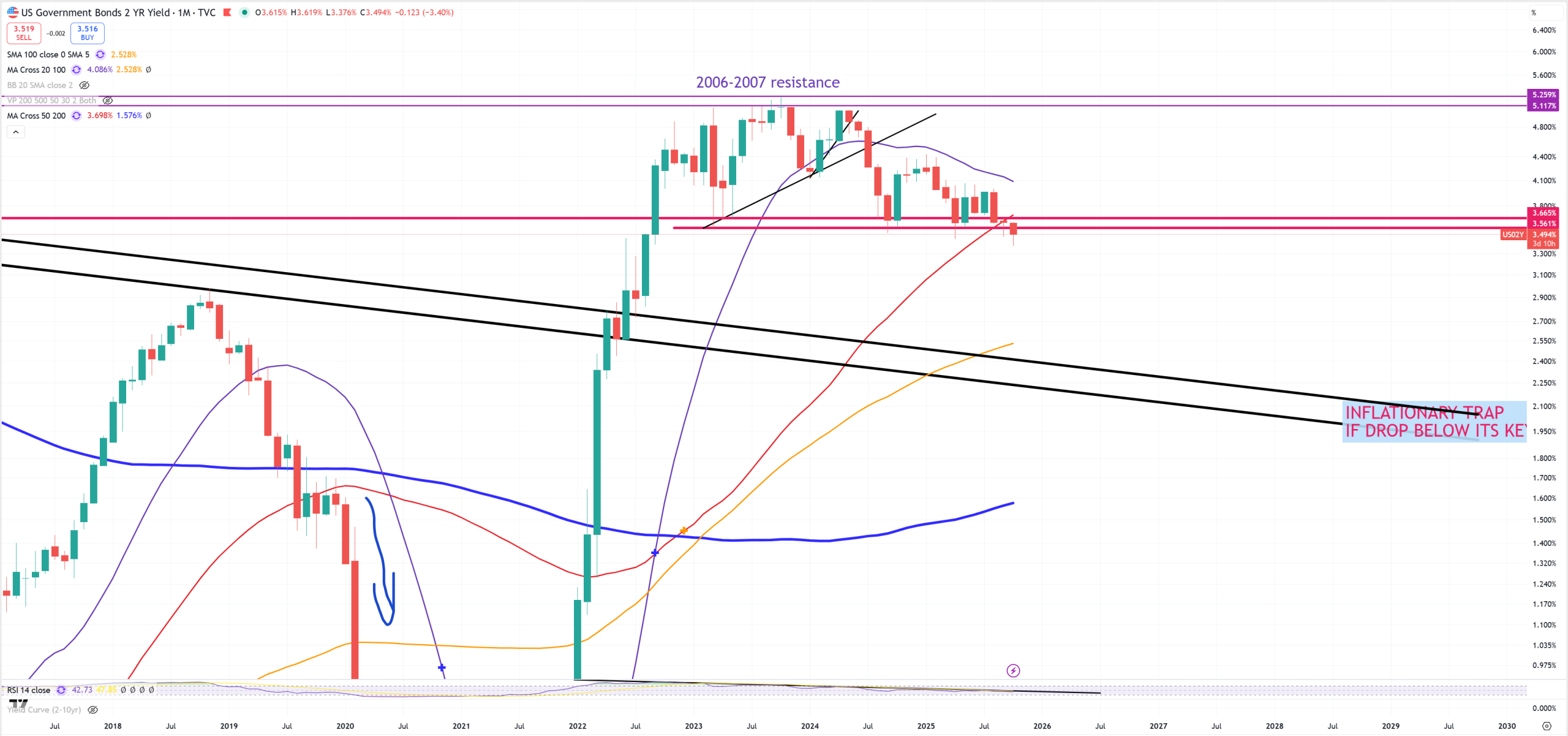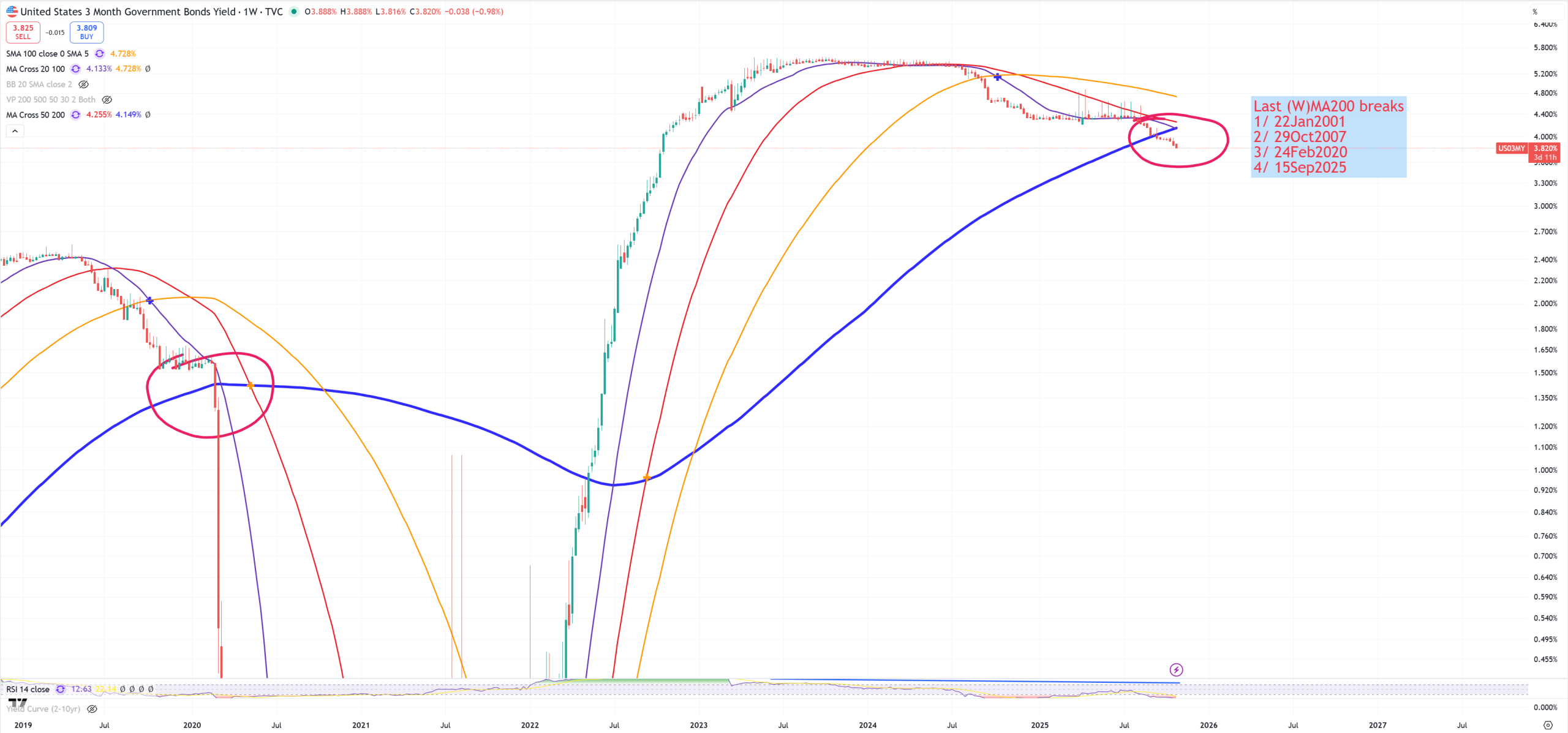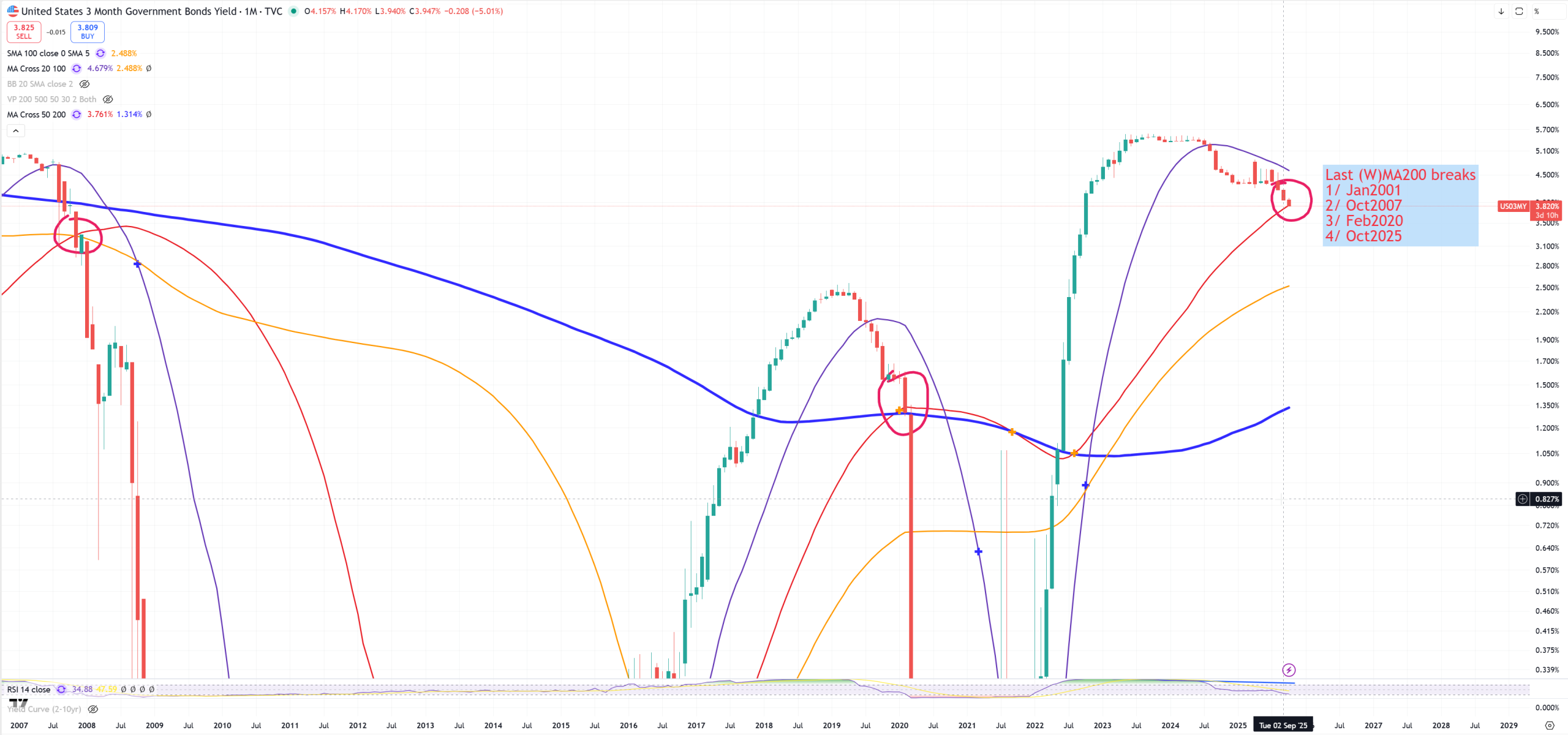 US02Y – US02Y gives us a prediction of US03MY and where FED Funds Rates should be. (W)MA200 break happened in July 2025. US02Y is 3.5% while FFR is 4.25% = FED is too tight by 75bps NOW.
