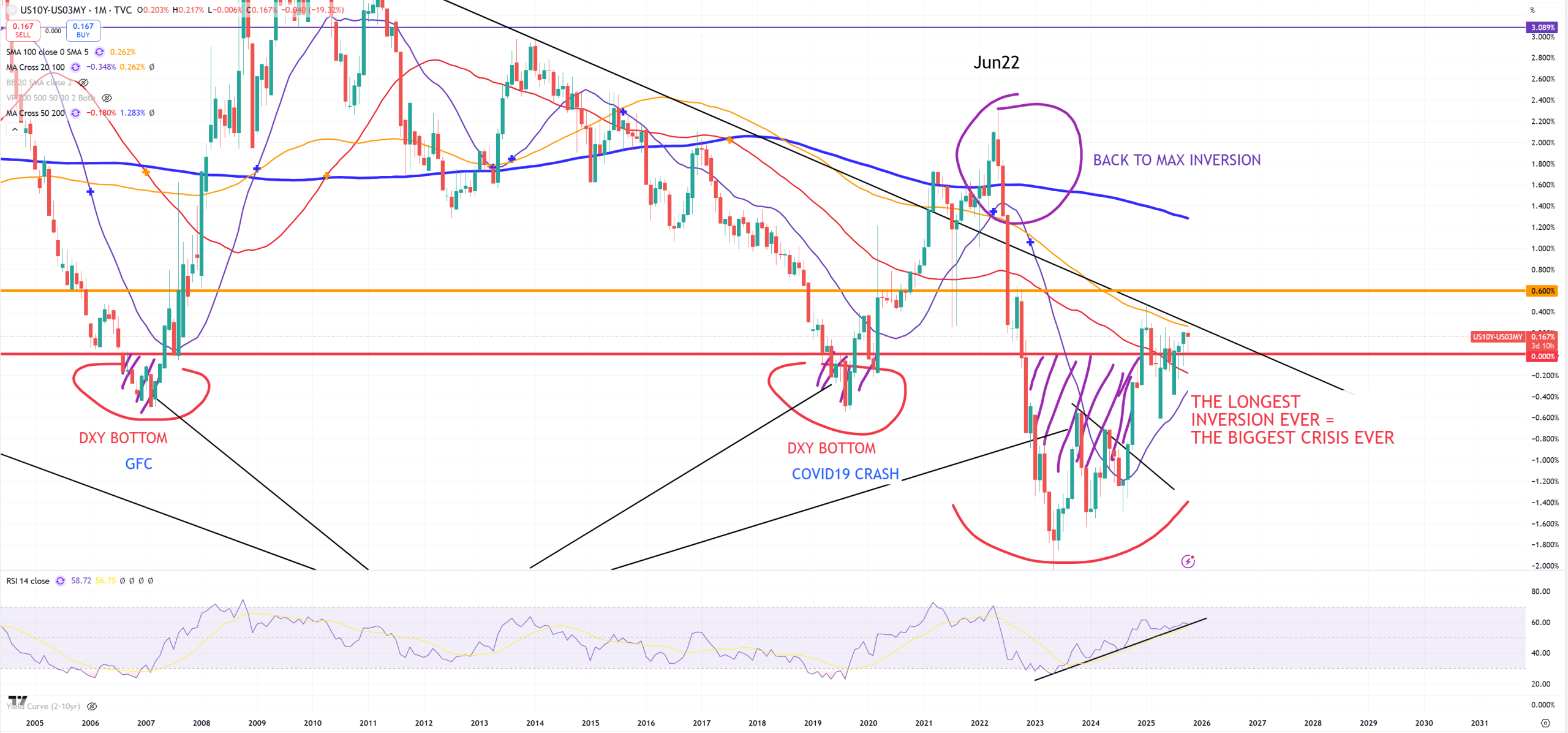 There’s also another key asset to follow. It’s DXY. This view is (3M) just like DJI/GOLD and SPX/GOLD and guess what. DXY holds the same technical indicator (3M)MA200 like DJI/GOLD and SPX/GOLD trying to break. The problem is even wider because we see even here something what I might call super secular golden cross where red (3M)MA50 crossing up blue (3M)MA200 creating this small yellow “+”. My assumption says : the longer and deeper 10Y-3M is inverted the higher DXY will jump at the end with 2 targets still 120 or 160. So the moment US03MY tries to cross down (M)MA50 the same moment DXY tries to find support around multiple key indicators like (3M)MA50/(3M)MA200, trend and (M)MA100.