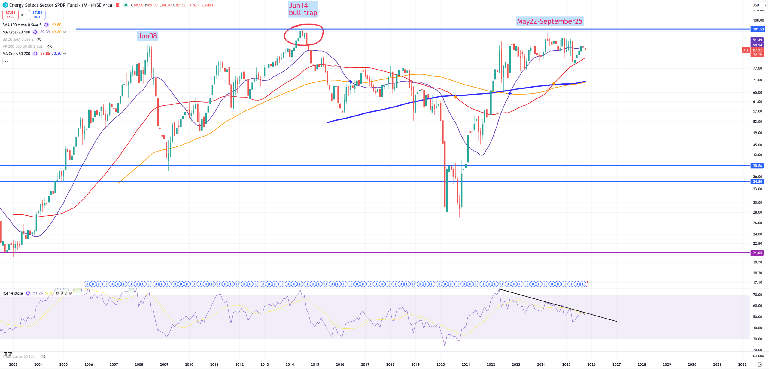 The first good example to show you how keeping yield-curve not uninverted is XLE. You see that on (M) that it’s banging towards Jun2008 resistance since May22, so in reality the moment 10Y/3M started to invert. As yield-curve uninverts the pressure for stocks is raising and pressure for DXY to go higher raising too.