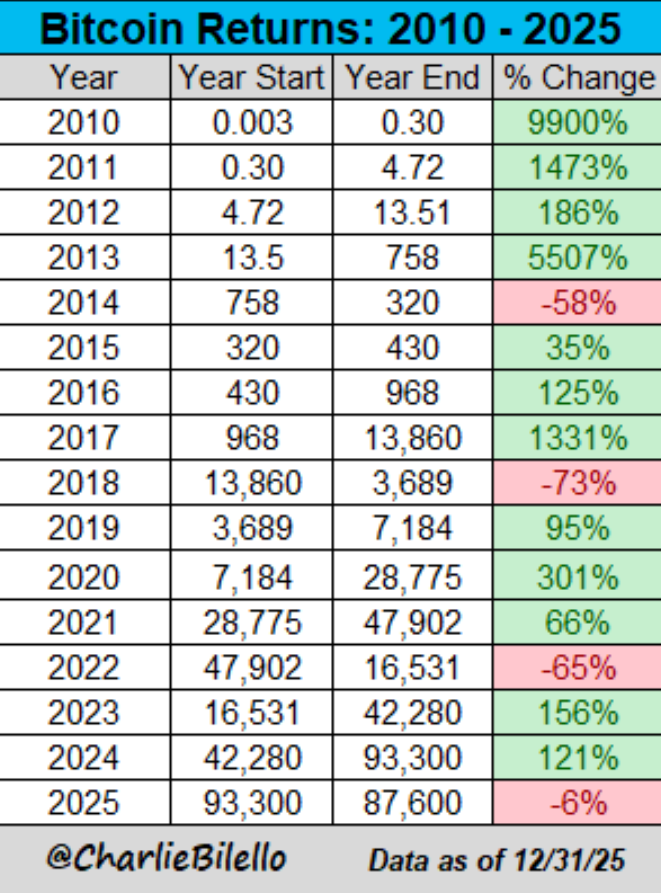 In one point I shared my view why crypto is on the edge of its first technical bear market ever. Maybe 2025 results were some kind of a prediction. @CharlieBilello as usual posted o X the summary of each year. What is surprising is the pair “Highest Return” vs “Lowest Return” which has not happened in a history, but it might give us a hint what’ll happen.