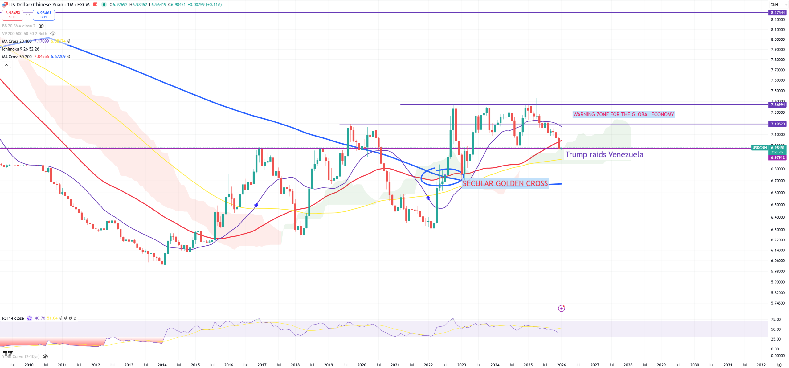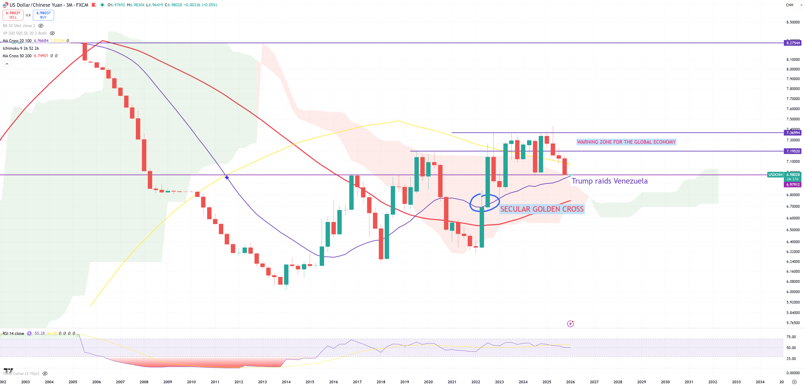 So just like DJI/GOLD broke (3M)MA200 in 1Q25 there was a spike of USDCNH around 7.37 but nothing happened, this resistance 7.36 still holds. We moved down to another support 7.20 and another support 6.78 which is (3M)MA20 and bottom in Ichmoku cloud.