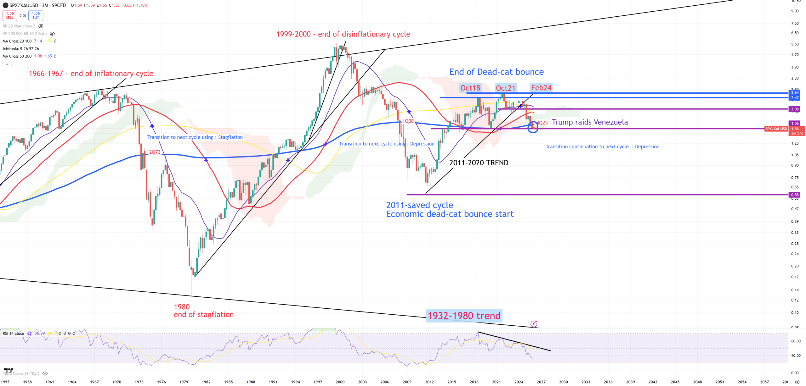 This 1Q25 “on the watch” topic below has so far not materialized, because SPX/GOLD did not confirm the break. Now it did since 4Q25. So this delay between 1Q25 (DJI/GOLD cycle indicator collapse) and 4Q25 (SPX/GOLD cycle indicator collapse) allowed $$$ to drop and forced market to rally. And again this is the first time ever those 2 cycle indicators broke (3M)MA200 with so big difference.