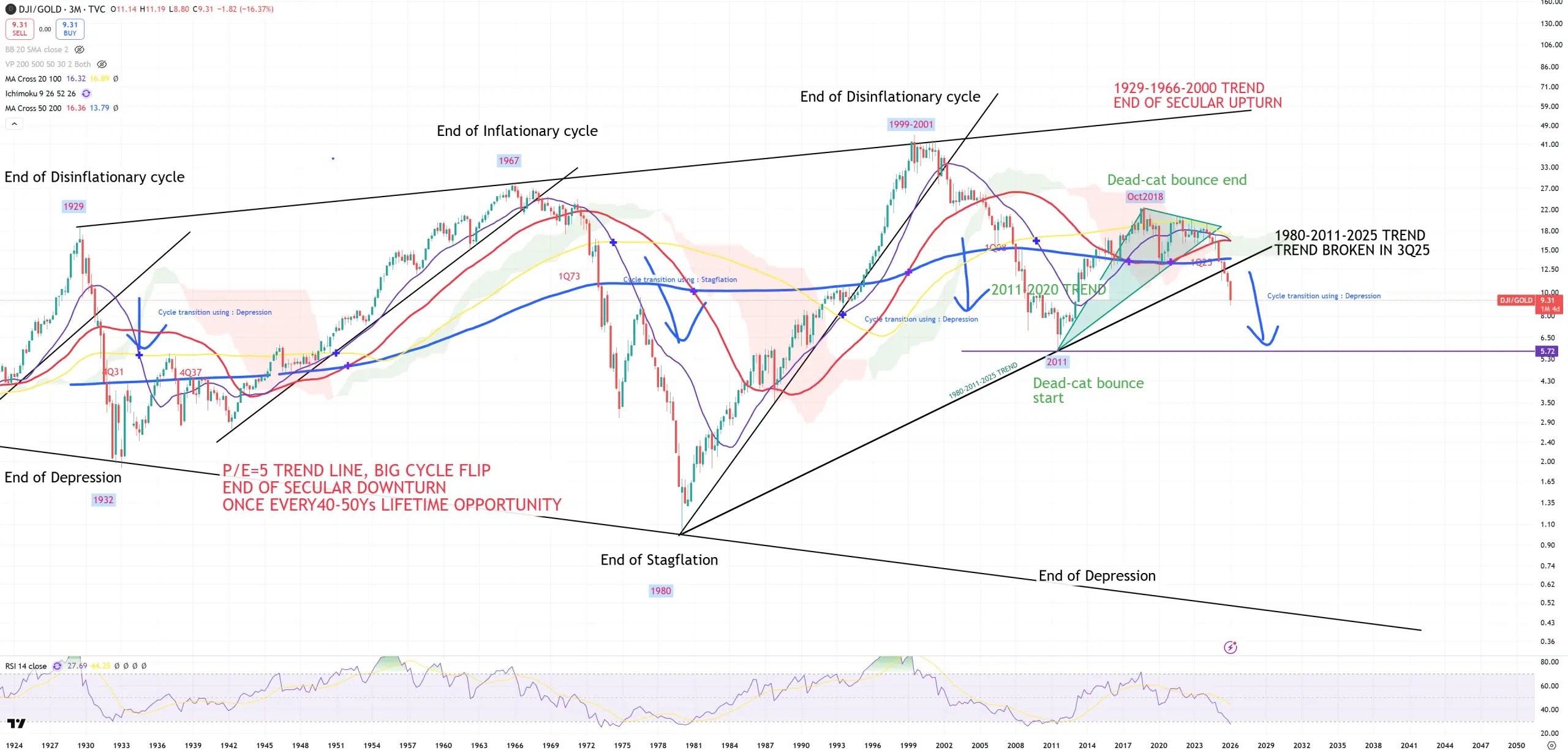 DJI/GOLD – 1st cycle indicator. I view this chart only on (3M) view. 1980-2011-2025 trend broken. Cycles are interlaced it means we rotate the cycle using deflation. Lower trend 1932-1980 is 0.5 and I think that’s where we are going. Sell gold if you reach this 1932-1980 trend line. Peak in 4Q18 ending 2011+ dead cat bounce.