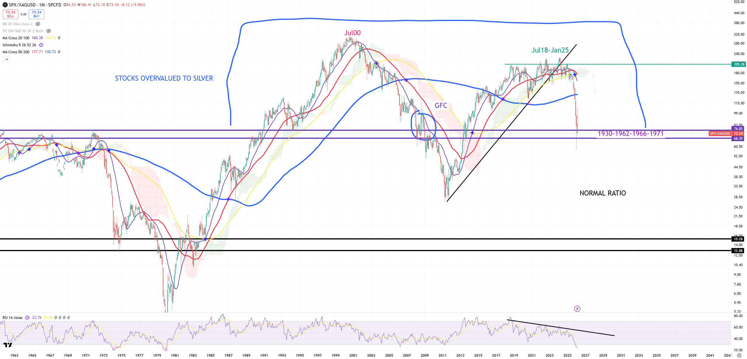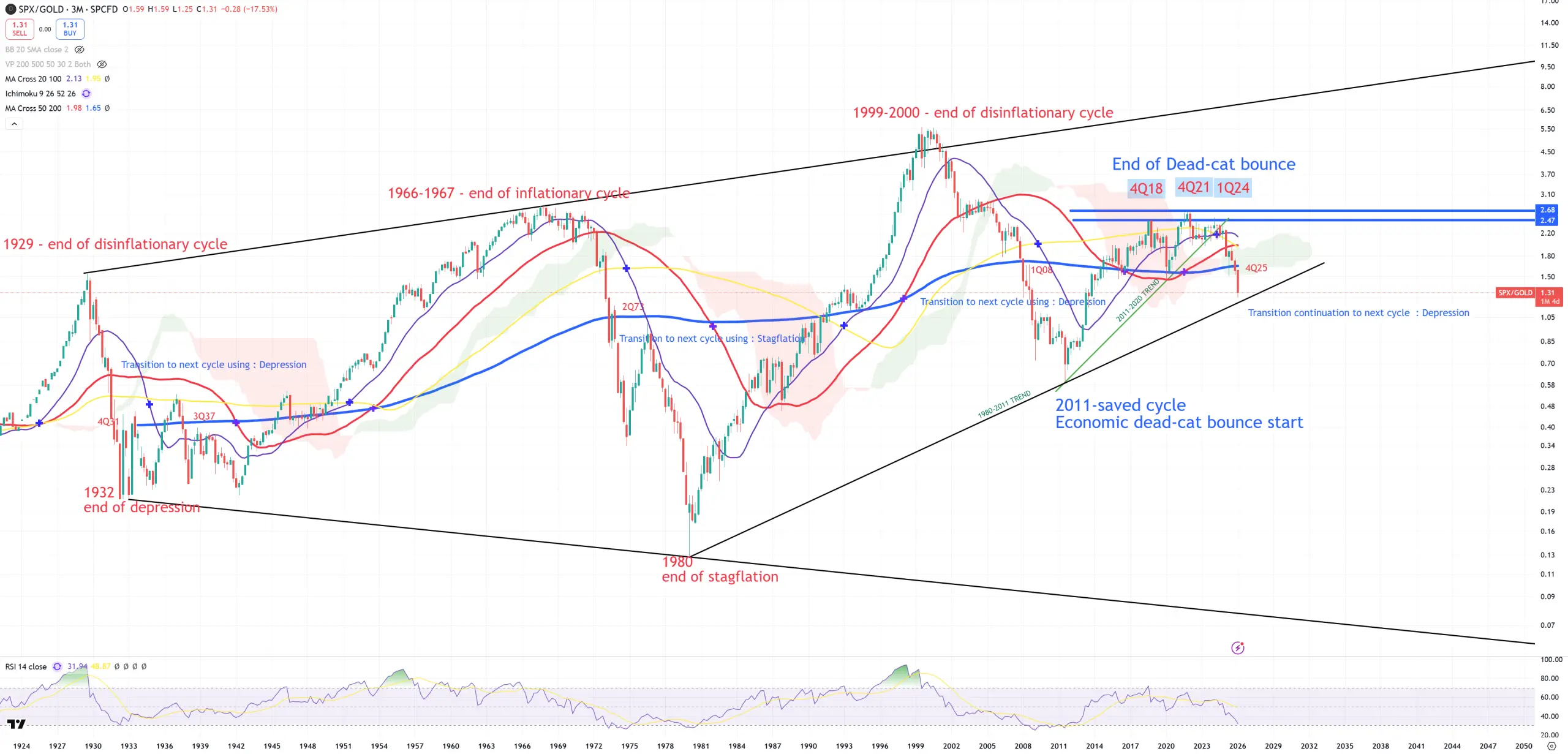 SPX/GOLD – 2nd cycle indicator. Peak in 4Q21, not 4Q18 like DJI/GOLD. Never in a history those 2 charts (DJI/GOLD vs SPX/GOLD) were so different. Looks like DJI/GOLD is more about forward looking, while SPX/GOLD is more about actual situation. 1980-2011 trend has not yet been broken here yet (because on DJI/GOLD it’s broken in 3Q25). Also (3M) view. SPX/GOLD was #1 chart I was looking at the whole 2025 : when it’ll break blue (3M)MA200. It happened in 4Q25 or more detailed : October/November 2025 – yes that’s the same date when US03MY broke (M)MA50. 1932-1980 trend is 0.07. Once SPX/GOLD broke (3M)MA200 and soon even break 1980-2011 trend there’s no possibility to reverse the economy without big troubles. The cycle has closed all doors. From this moment only bad events or worse events. 5th break of (3M)MA200 : 1931, 1937, 1973, 2008, 4Q2025.