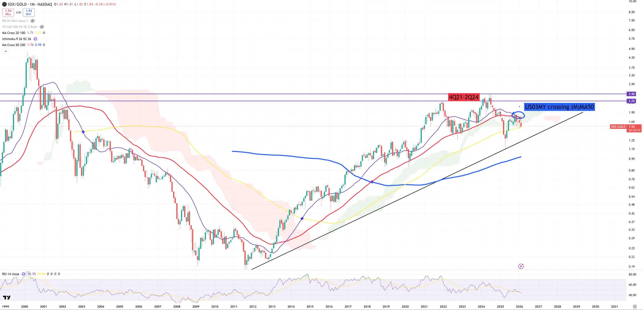 SOX/GOLD – let’s call it a cycle indicator for our AI bubble. Highest point : 2Q24. This 4Q21 was lower but not super low. We clearly see a big cyclical decline of SOX from 2Q24. Break (M)MA50 and entering a technical bear market for the first time since September 2001. The moment we retest (M)MA50, US03MY broke its (M)MA50 – the same time Nvidia hit its 212$ level. As I’ve been saying, the biggest crashes happen when market break (M)MA50, retest it from the bottom and fail. Since September 2001, market was retesting (M)MA50 till April 2002, and once this retest failed, NDQ dropped another -45%. This ratio and this technical position mostly tell you : You have no idea how low SOX can go. Let’s wait when 2011-2012-2025 black trend will be broken.