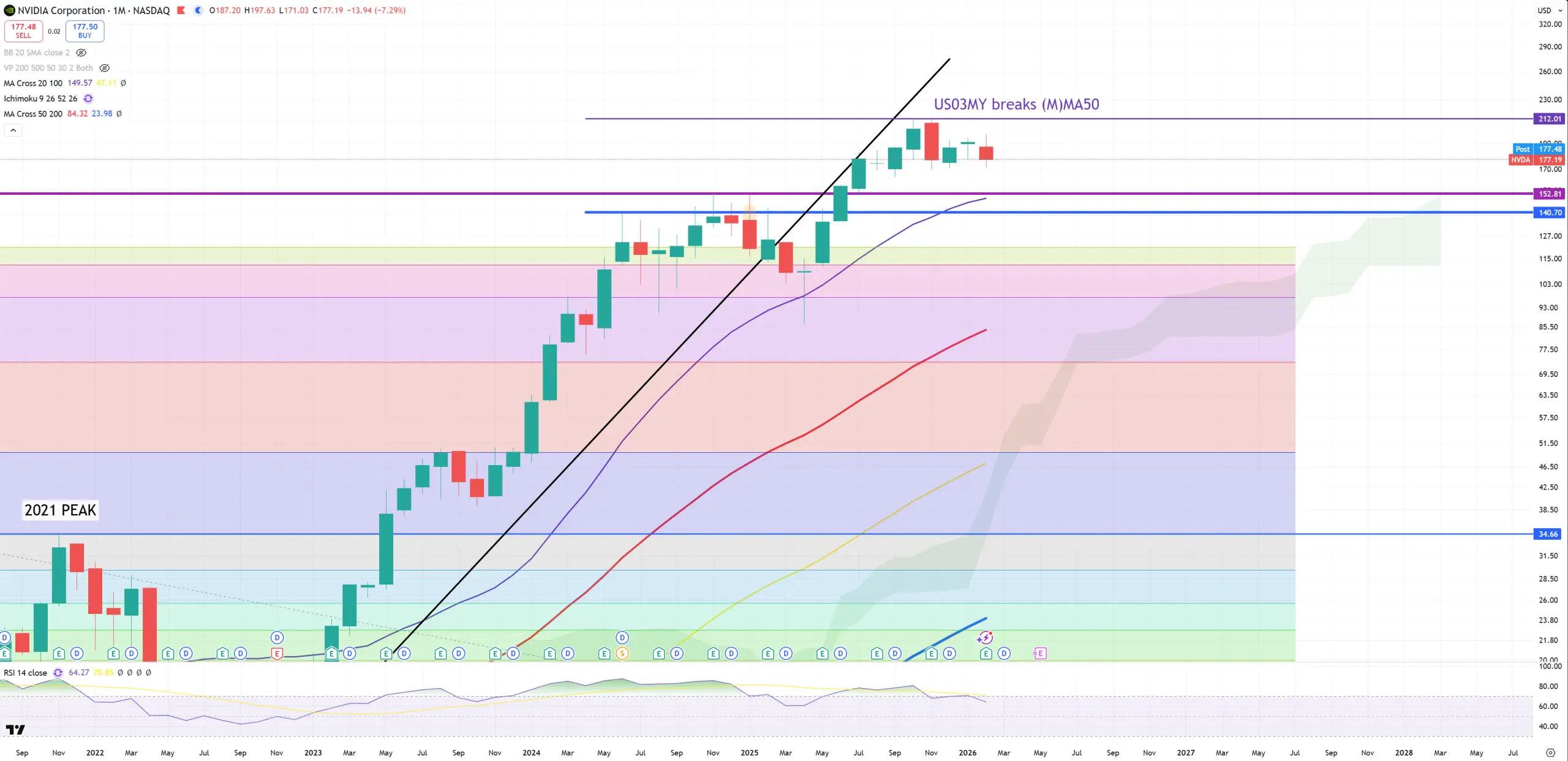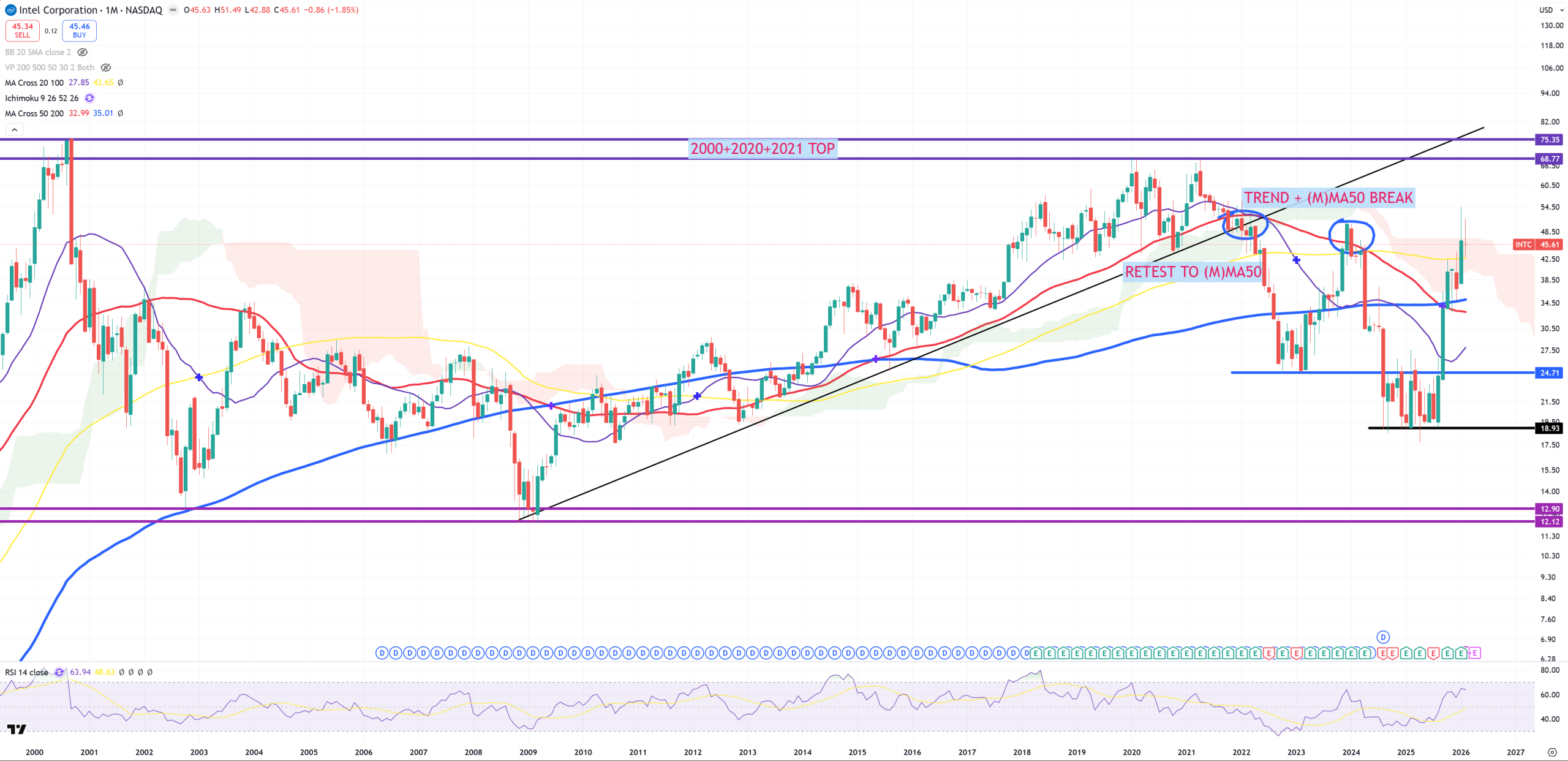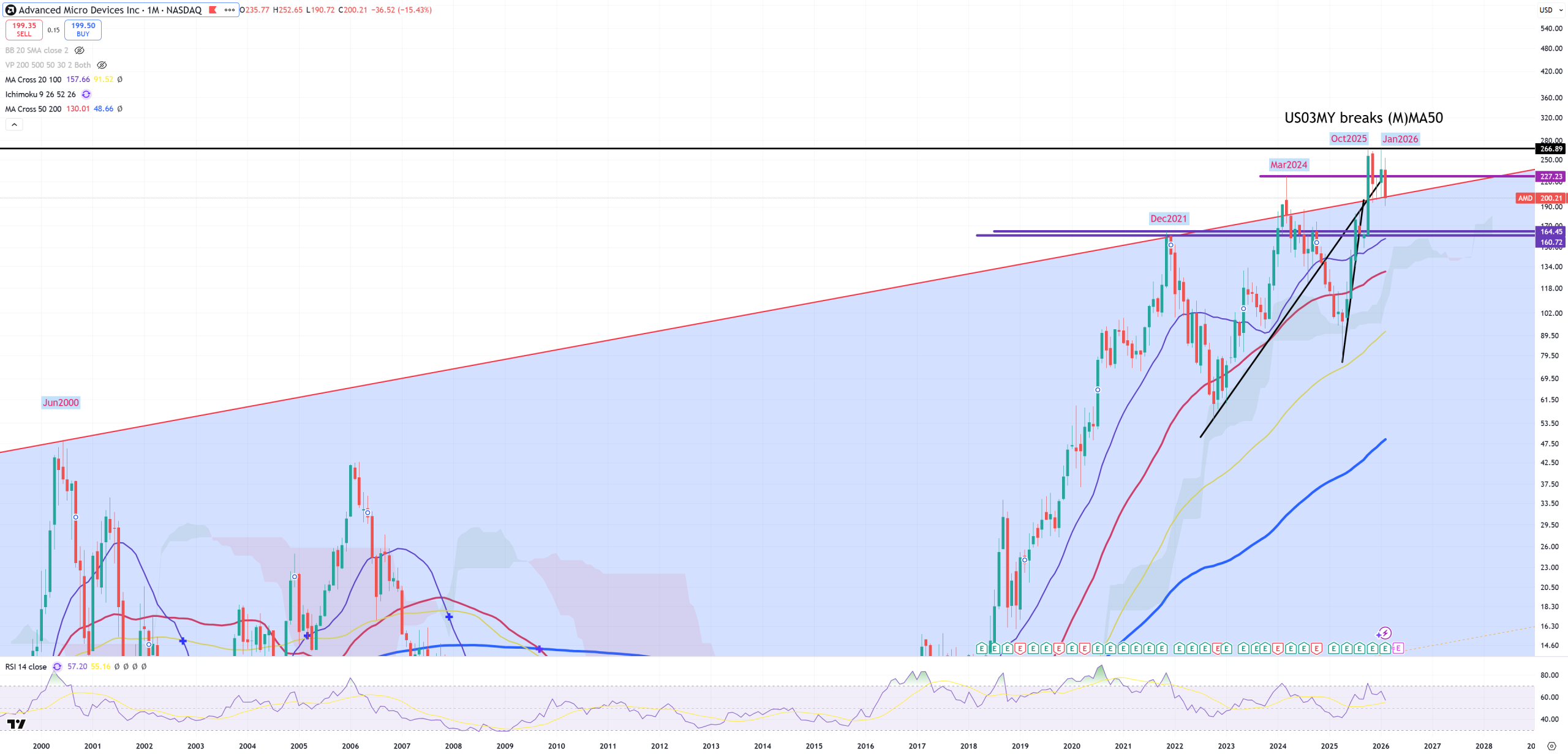 AMD – 1984-2000-2021 trend, a small spike above ended up by March 2024, later huge spike and double-top Oct25-Jan26 = US03MY breaks (M)MA50 level. It wants to go back below its main 1984-2000-2021 trend.