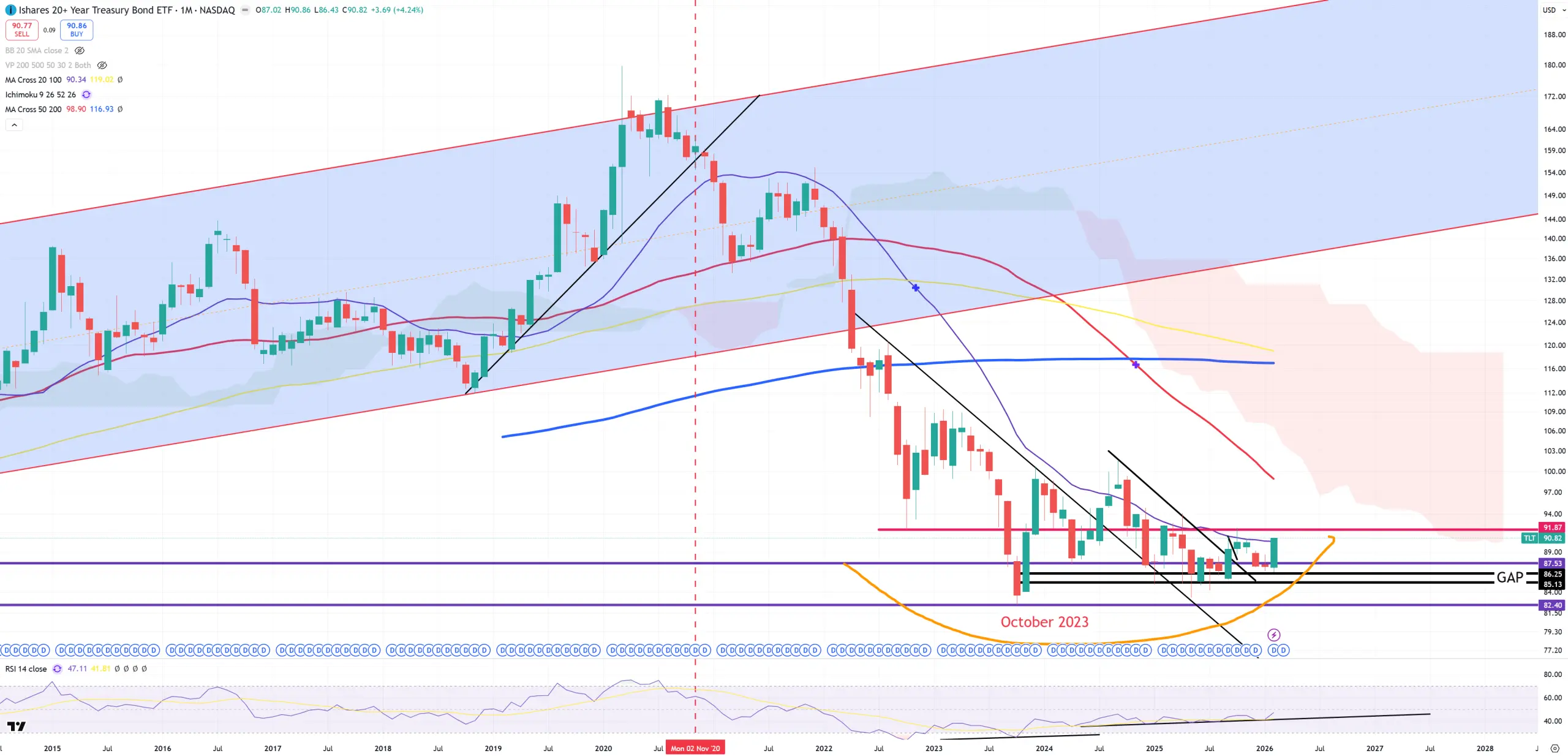 TLT – my old prediction says October 2023 82$ is the bottom – we closed above (M)MA20 in Feb2026 = possible trend change.
