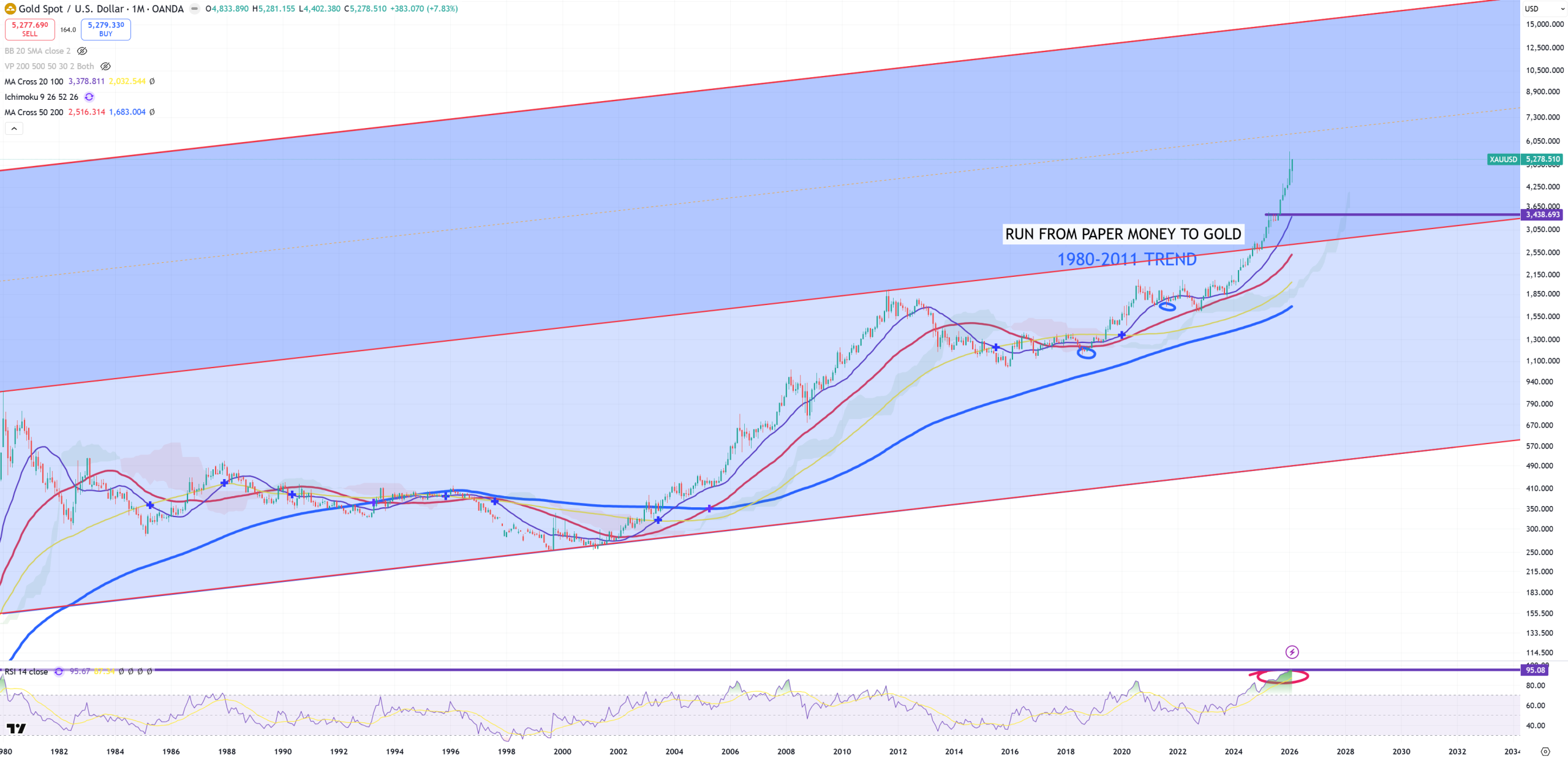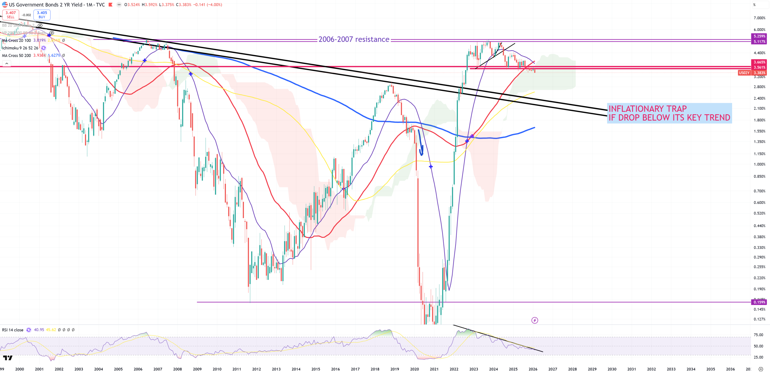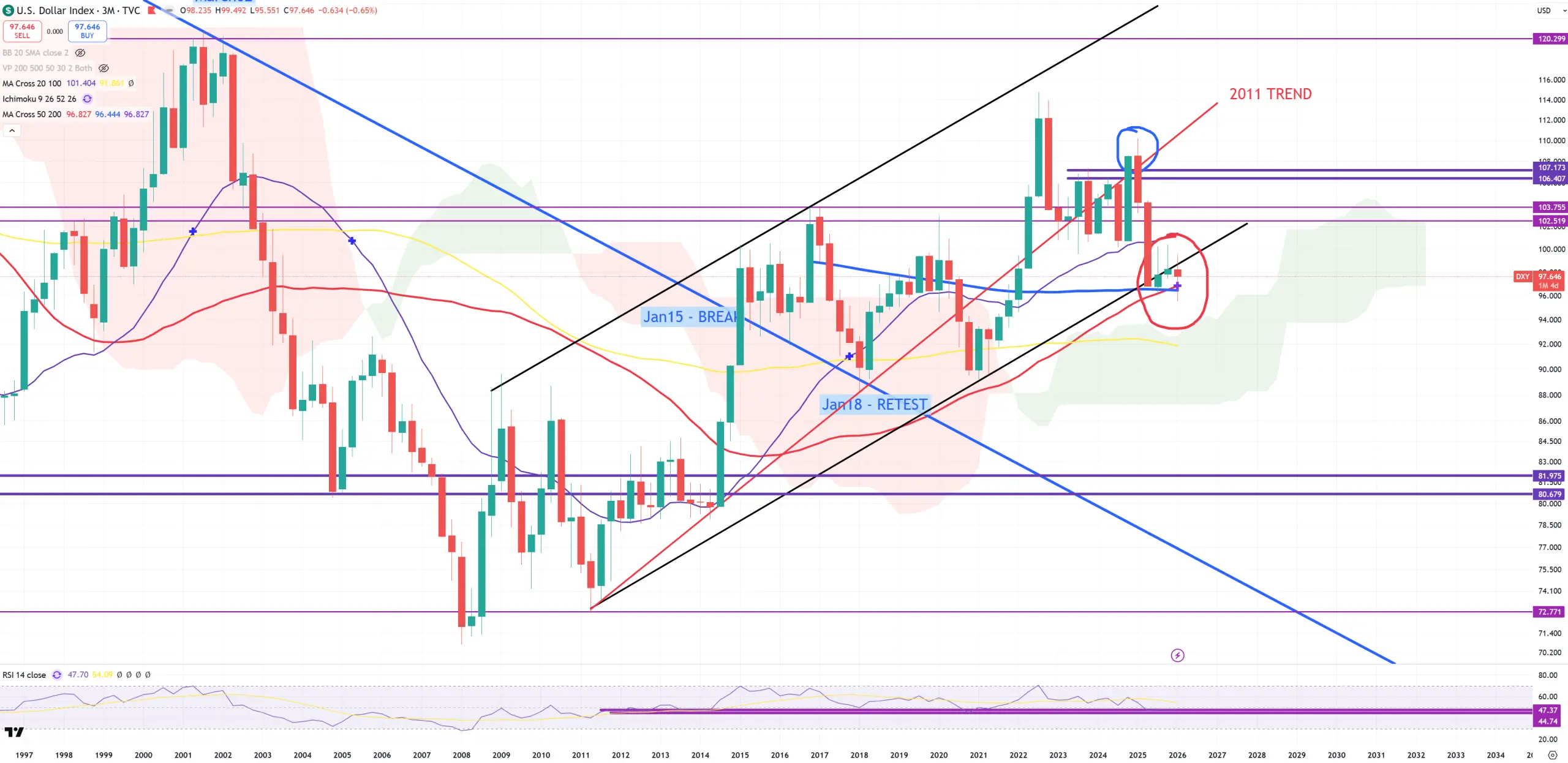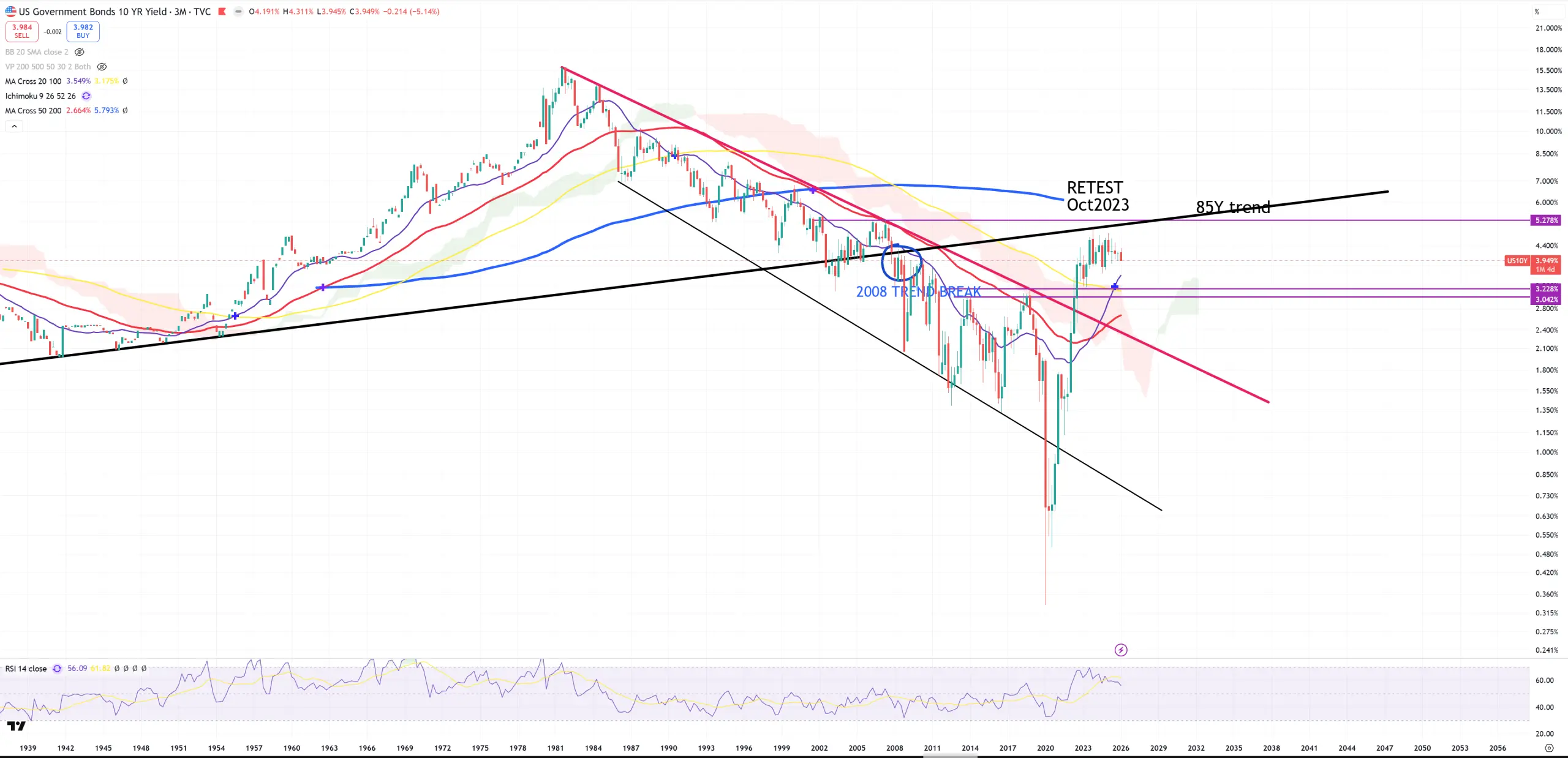 US10Y – in this (3M) view you can see where October 2023 really is. That’s a moment called : BONDS AFTER INTEREST RATE SPIKE from the Kondratieff seasons. That’s probably the most powerful retest to broken long term trend I’ve ever seen. This October 2023 is in reality a moment where true secular bear market in bonds would have arrived. 85Ys trend matches also blue (M)MA200.