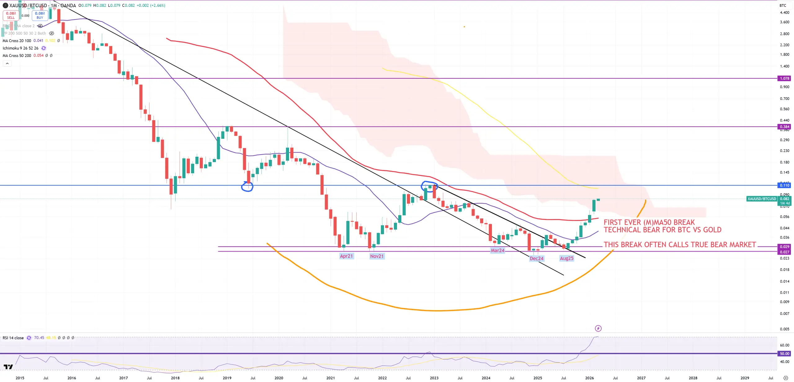 BTC starts below 2021 peak, and when that happens it’s already DONE, As GOLD/BTC found its resistance on 2021 level, it was just a matter of time when we’ll go below 2021 peak. This move above 2021 peak (> 70k$) was just a massive bull trap and distribution for BTC maxis who were trying to convince the whole world BTC is going to 1M$, while in reality it was entering its first true technical bear market ever. You see that this 2021 level is around red (M)MA50 another technical border between bull/bear. Late 4Q22 we managed to break this (M)MA50, but the same time GOLD/BTC ratio failed to break its (M)MA50 = that was just a bear trap that time, but it looks now a true ugly big bear has entered the game.