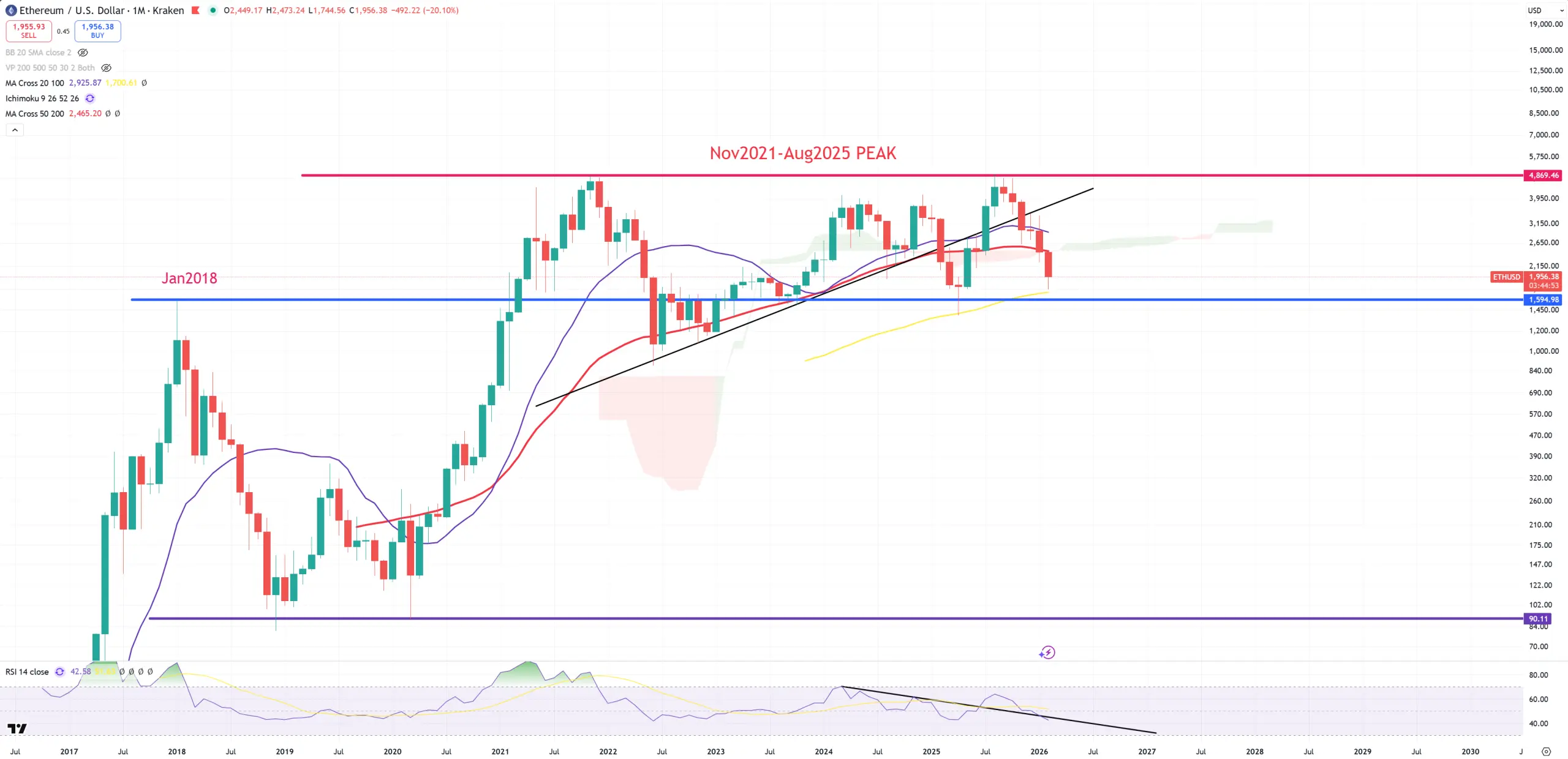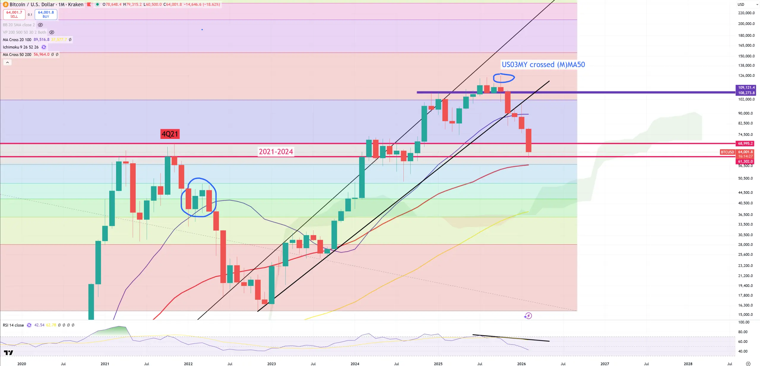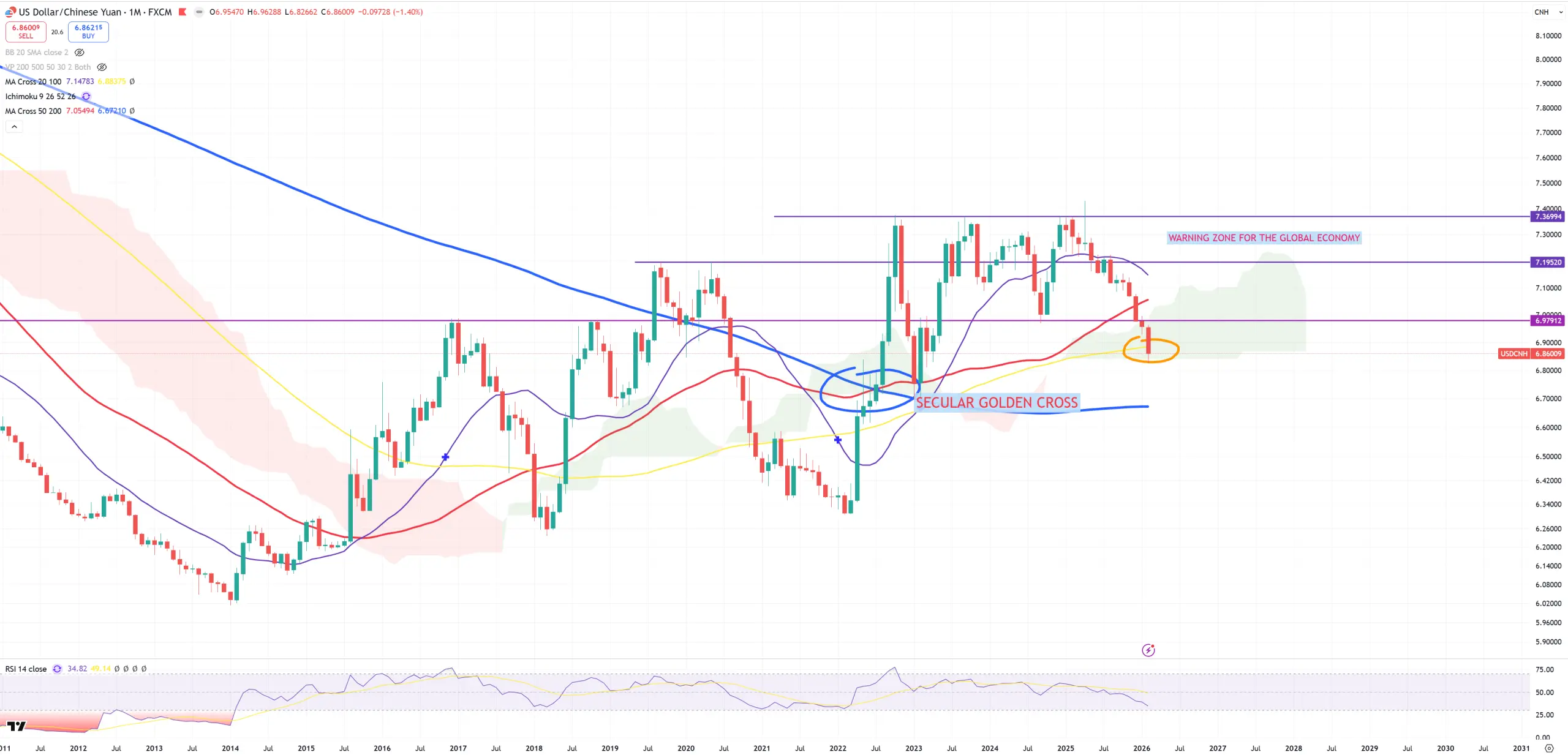 I use 4 (M)MAs and here’s my interpretation. Violet (M)MA20 = high momentum bull/bear market, red (M)MA50 = technical border between bull/bear, yellow (M)MA100 = middle point often bull/bear trap level, blue (M)MA200 = secular bull/bear market.