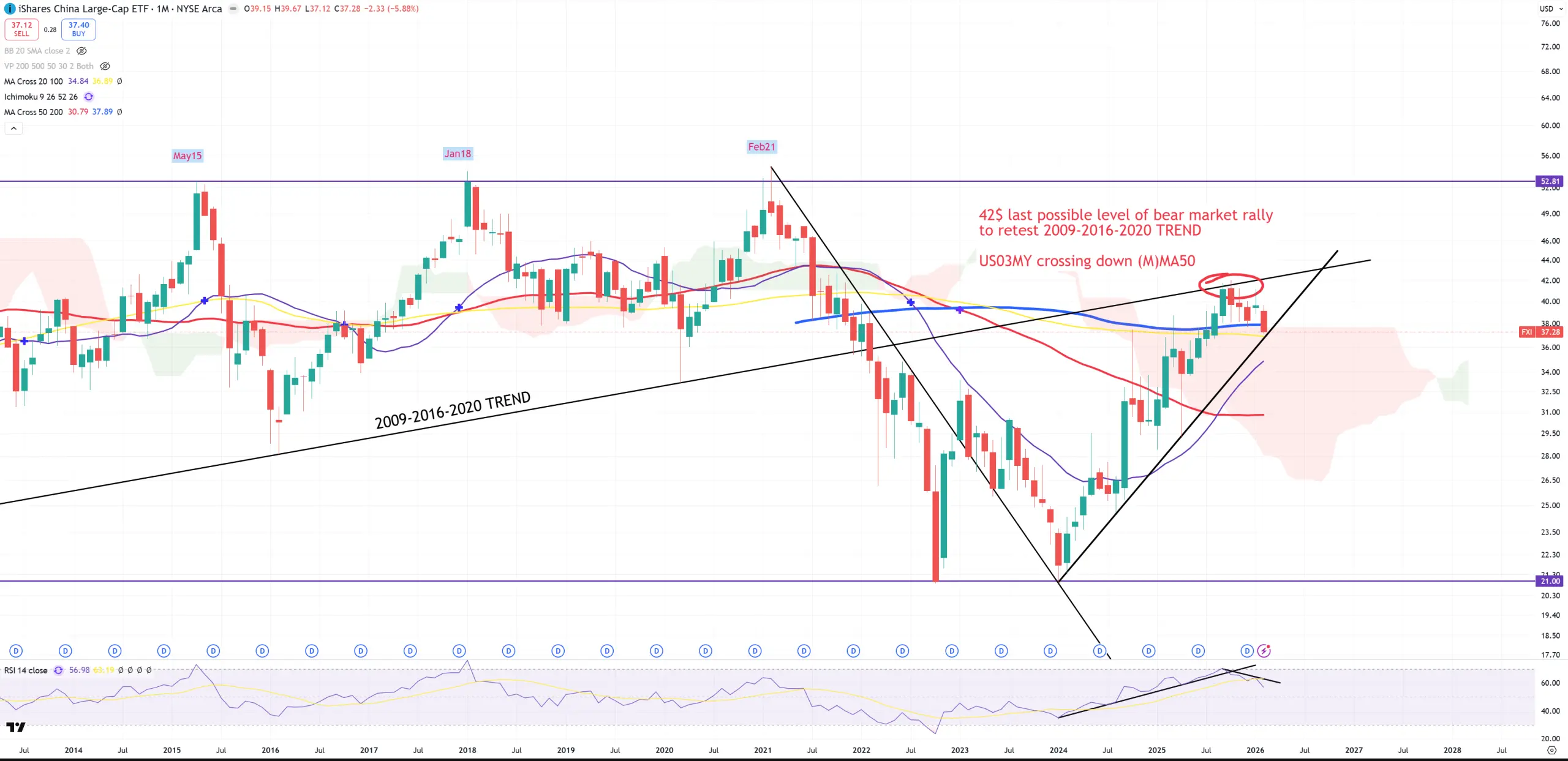 FXI – China after 2.5Ys of bear market rally since the beginning of 2024 reached its last possible point to retest 2009-2016-2020 TREND, even breaking (M)MA200 – secular bear market border, but in February 2026 we managed to close below (M)MA200 and probably we open below the trend.