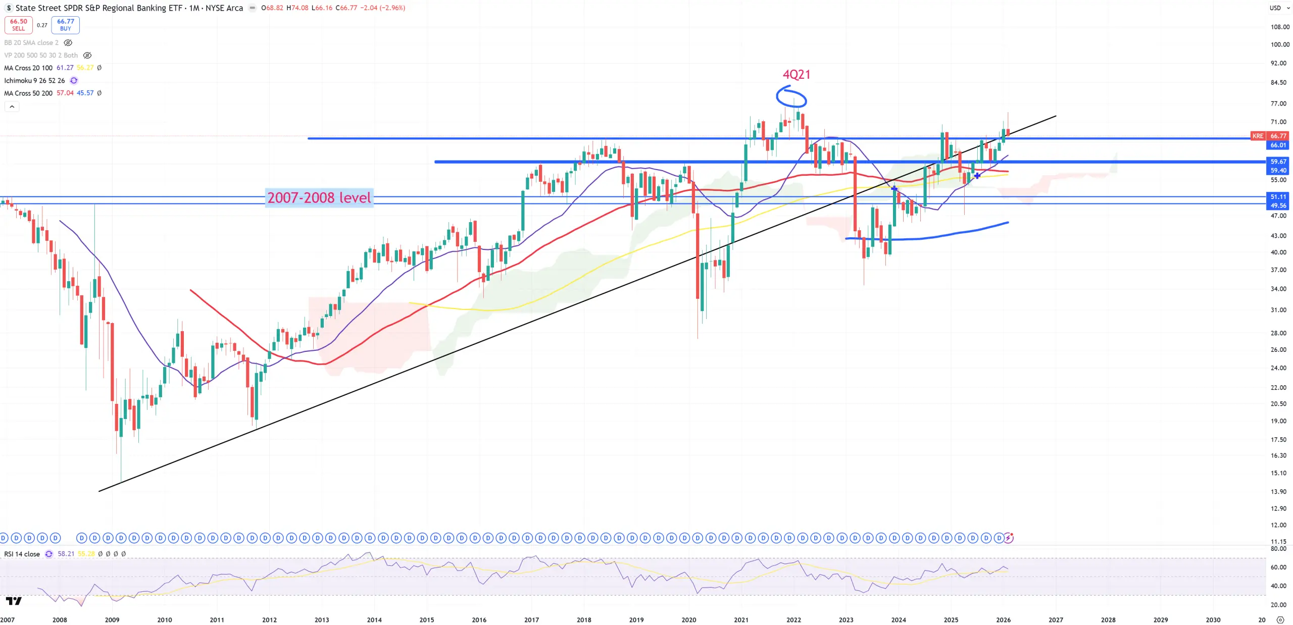 KRE – 4Q21 is a peak and now all the game is about the massive 2009-2011 trend line :