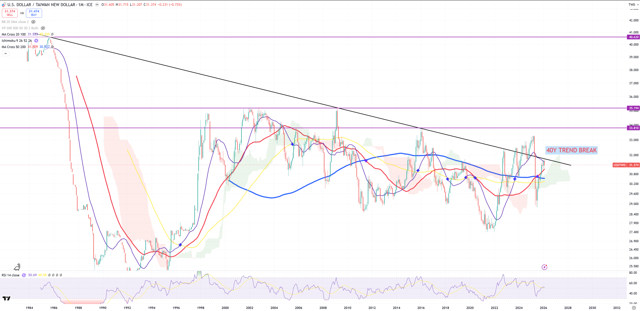 USDTWD – again razor thin. Big break or reject 40Ys trend