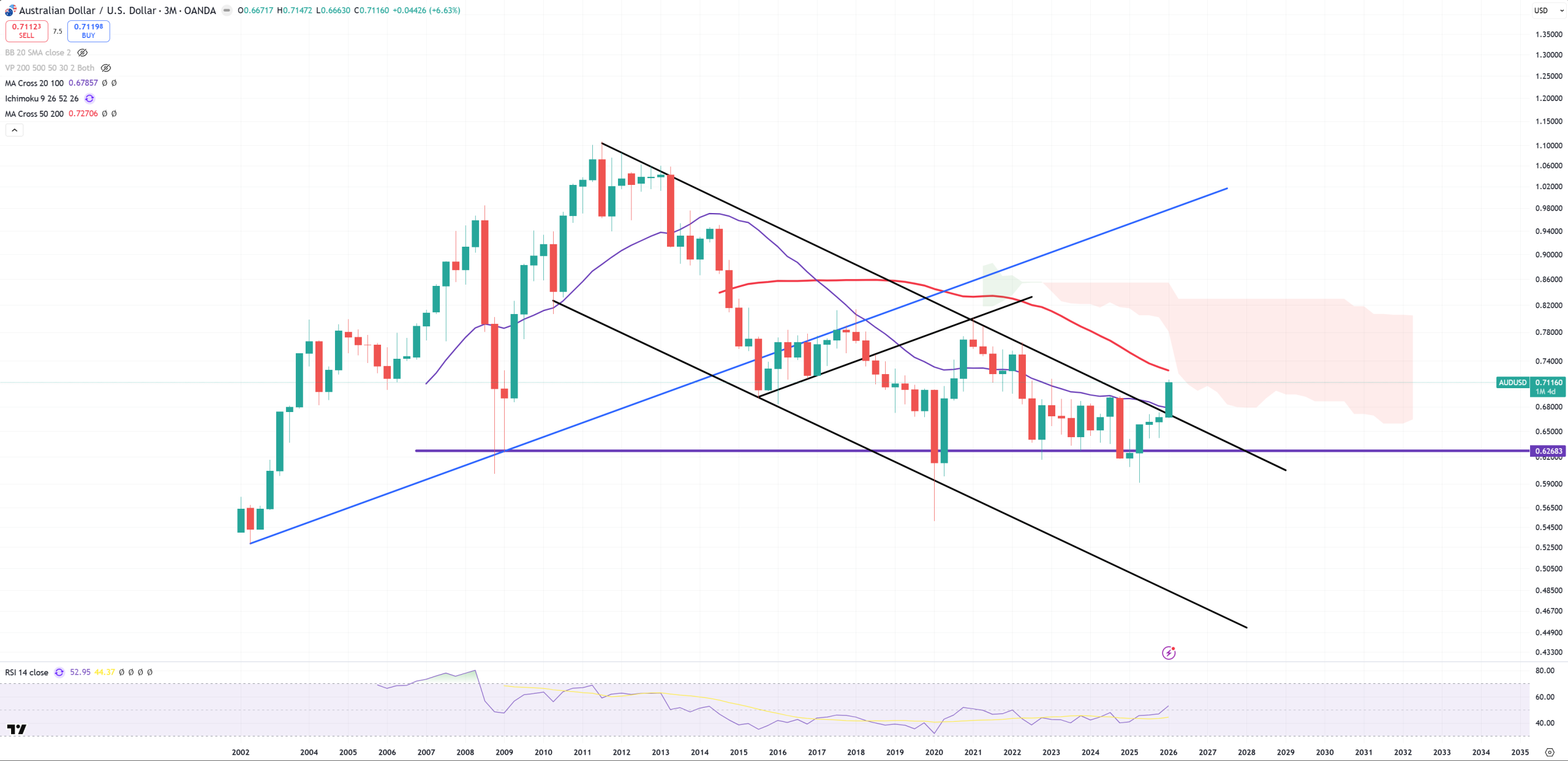 AUDUSD – it’s a derivative of USDCNH, so as USDCNH breaks (M)MA100 we also see here some junction break and that’s correct. This is 3M view to get wider view