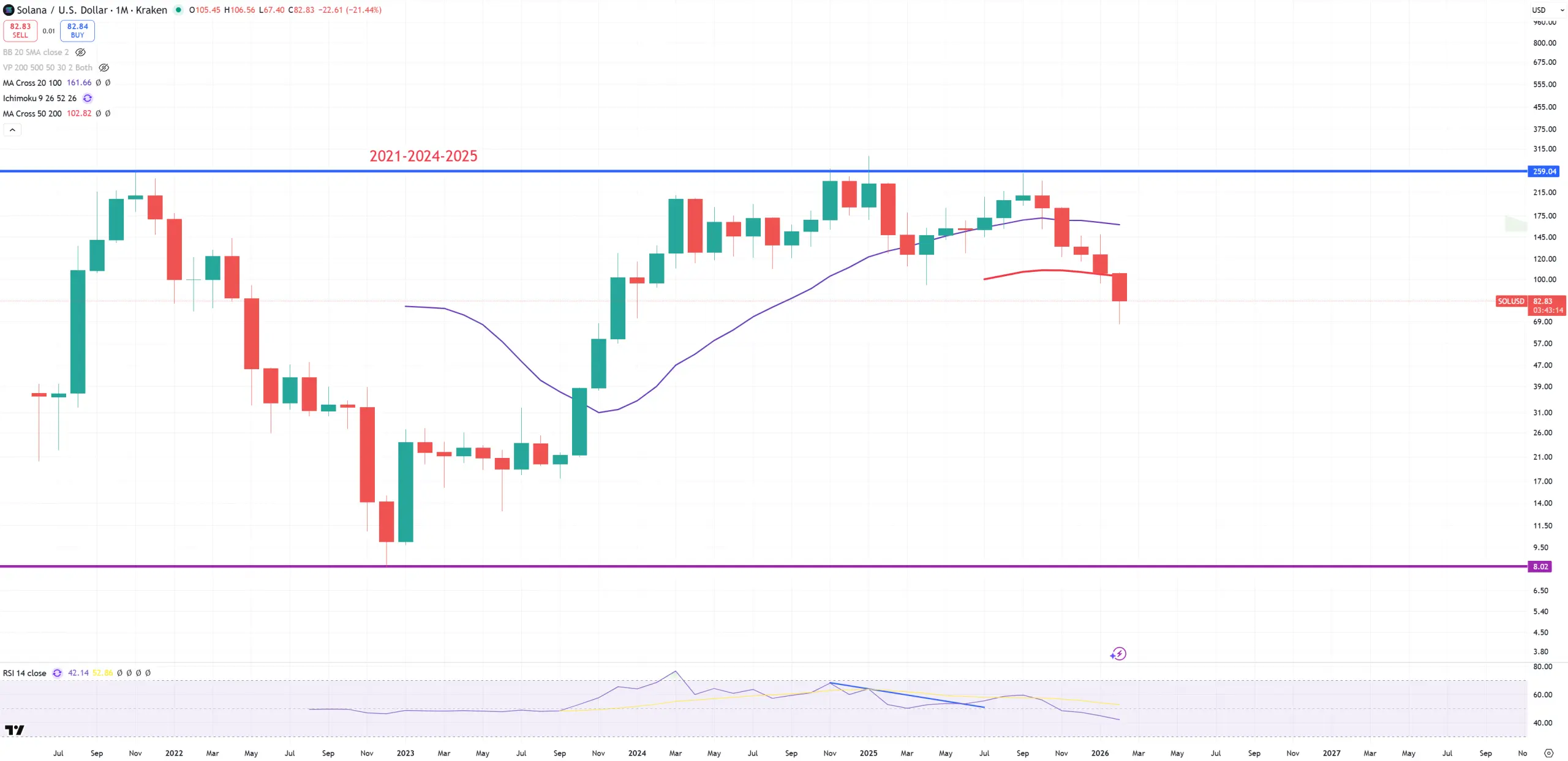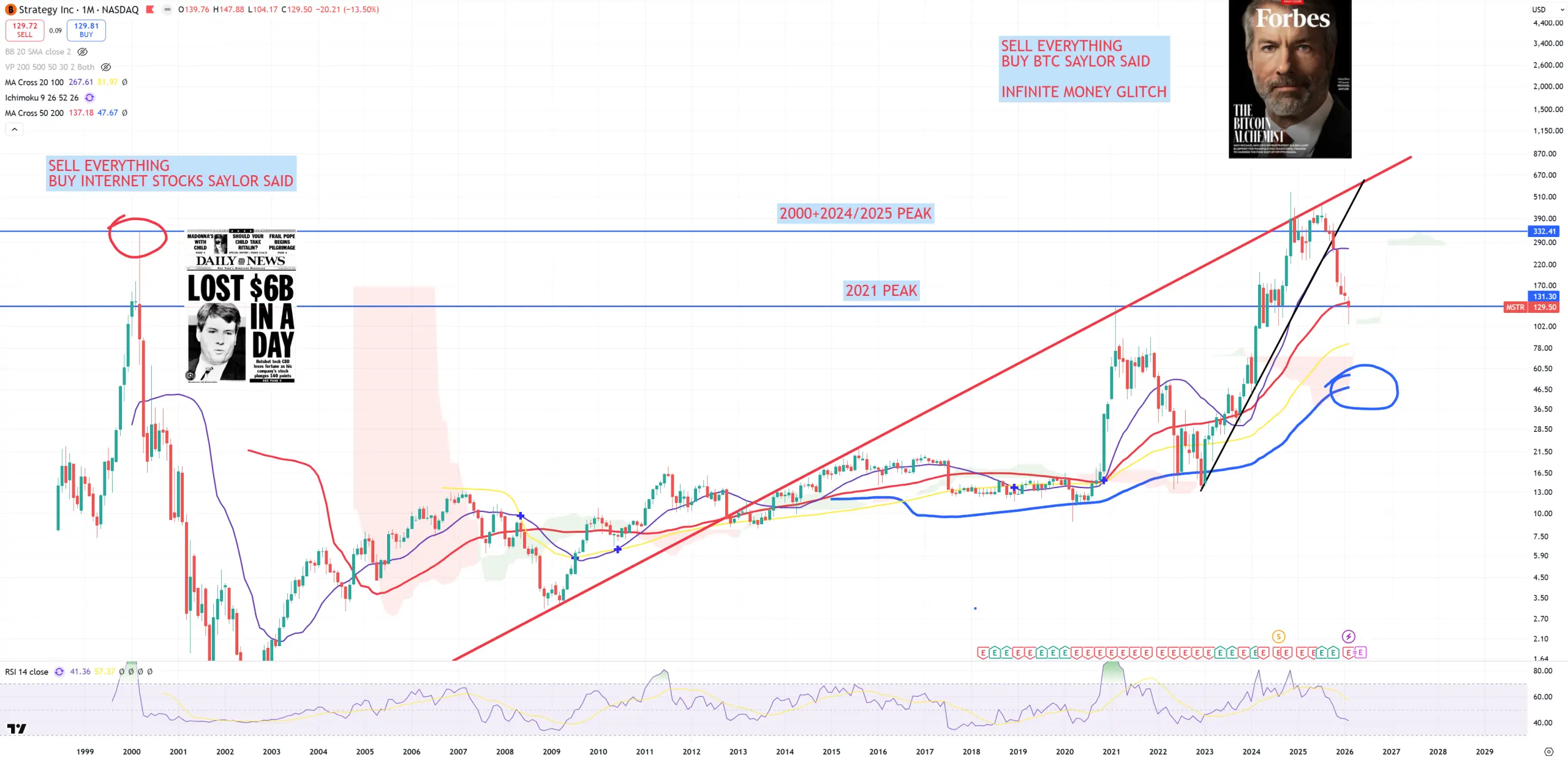 MSTR – we can’t forget about the main BTC Treasury machine. The situation looks dramatic for MSTR. It placed a double-top (with some false spikes) with infamous dotcom bubble peak, crashed without any bounce below (M)MA50 and 2021 peak. If it won’t regain above 2021 peak and red (M)MA50 it’ll crash another 50-80% with final target on blue (M)MA200 = 40$.