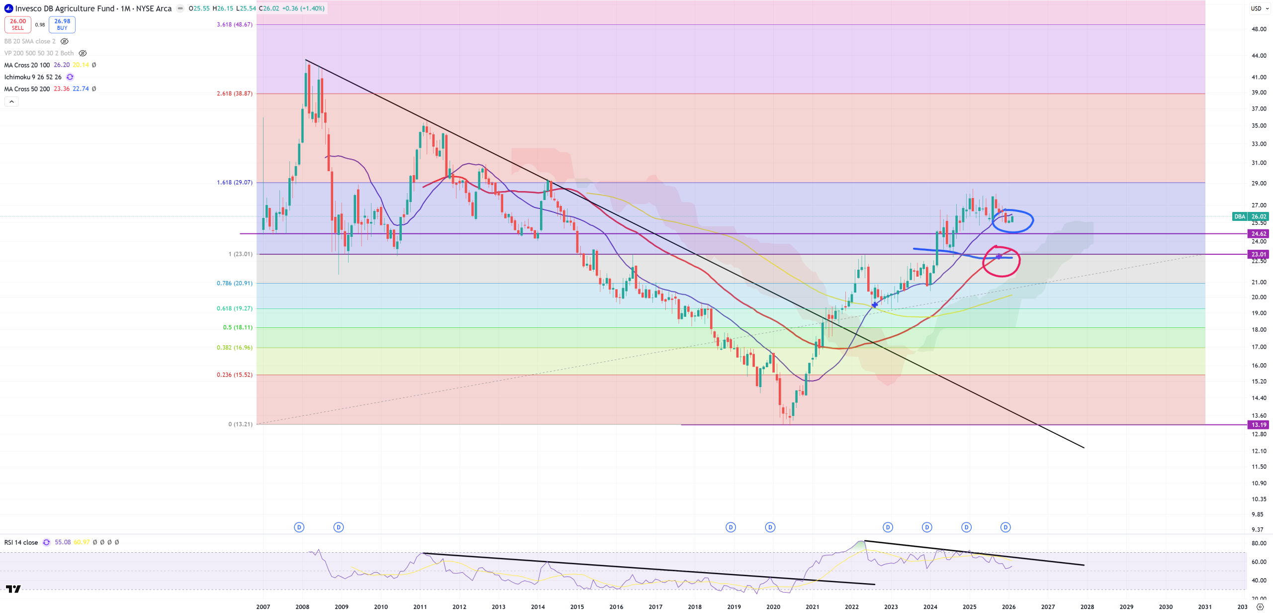 DBA – Agriculture – retesting (M)MA20 from the bottom with negative divergence of (M)RSI = possible trend change, but now secular golden cross is exactly on the same support level as 2009-2010 level :