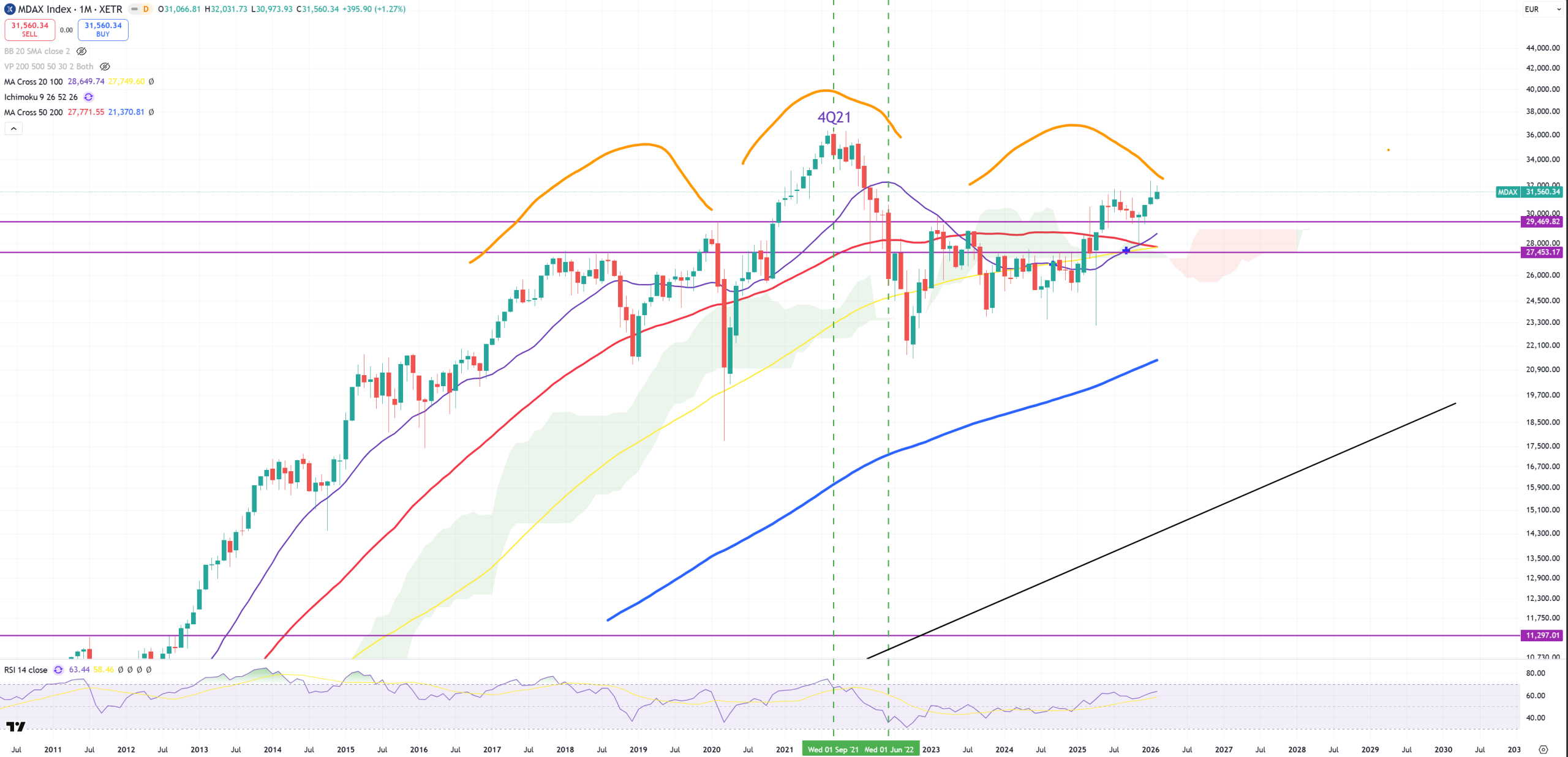 mDAX – mid-cap DAX – Germany are in a downturn since 2018. While DAX has exposure to global world, mDAX is mostly about local market. It’s still below 2021 peak, but I did not expect to jump above red (M)MA50 since some time.