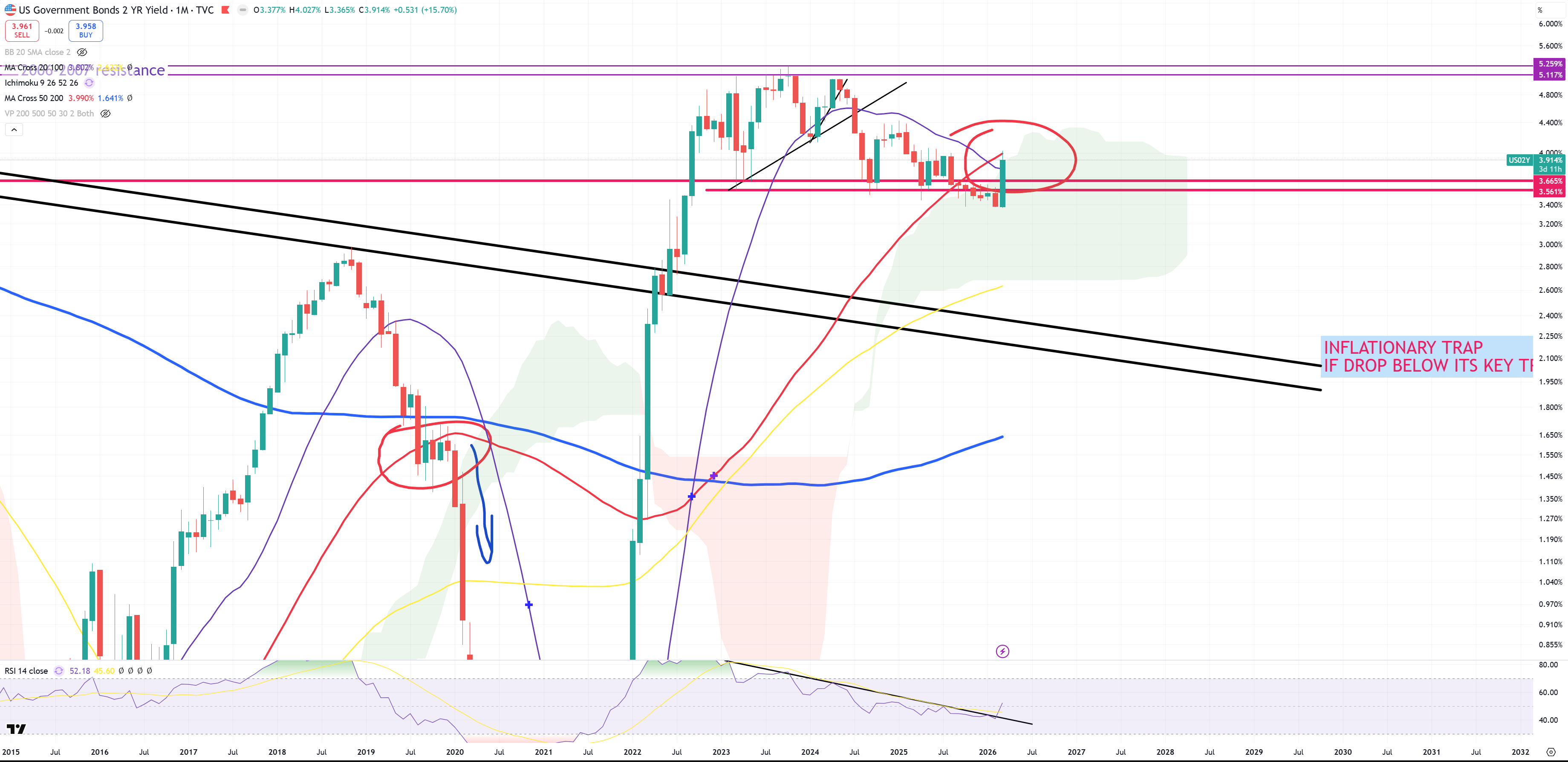 It always so far works this way. You see during 2020 how it worked. Break below red (M)MA50 later couple months of retest and financial crisis. This is exactly the same setup now. I bet this 4.00% will be rejected.