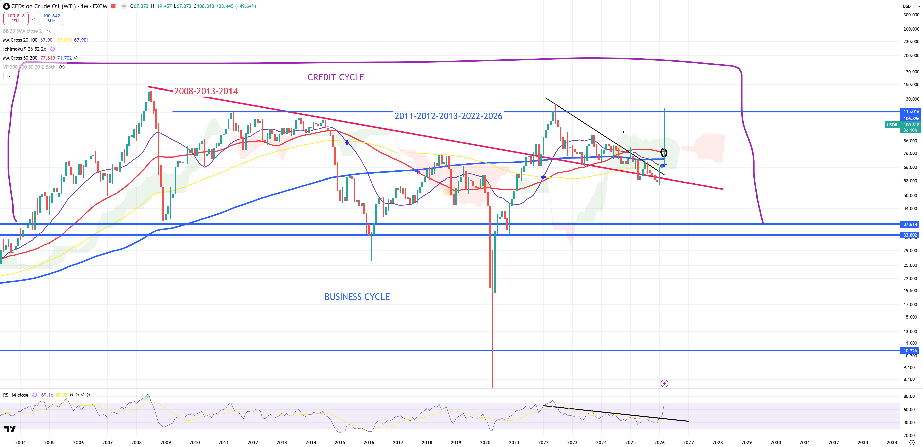 I know there’re bets about 200$ oil, but so far I don’t favor any side of the oil, but there’s a magical dependency between US02Y retesting (M)MA50 and same time oil retesting key resistance level.