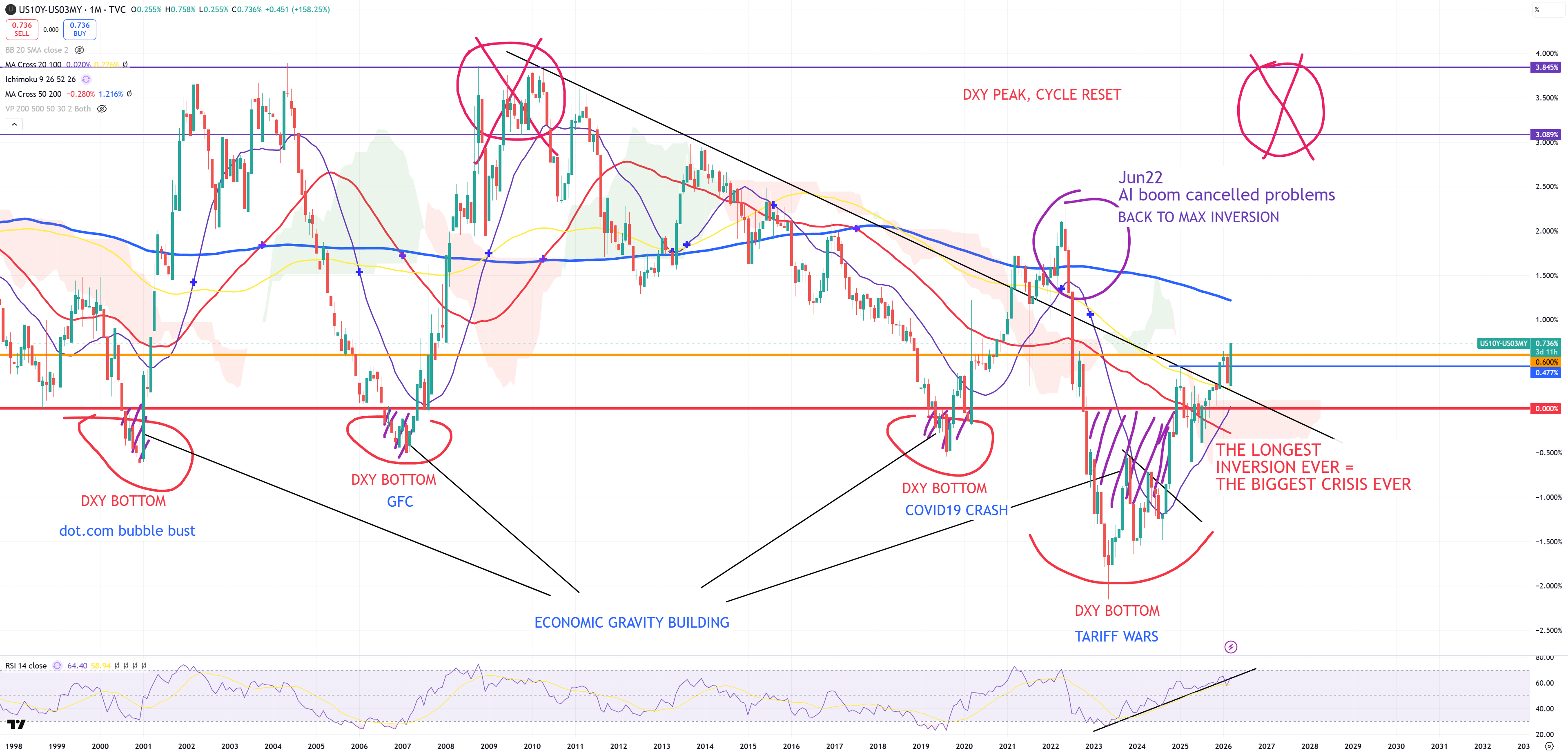 Once 10Y/3M uninverts and jump > +60bps permanently it’s game over for the stock market. Some time ago I said I believe this time the break will be permanent as SPX/GOLD broke (3M)MA200 in 4Q25 and US03MY broke (M)MA50 in 4Q25 too