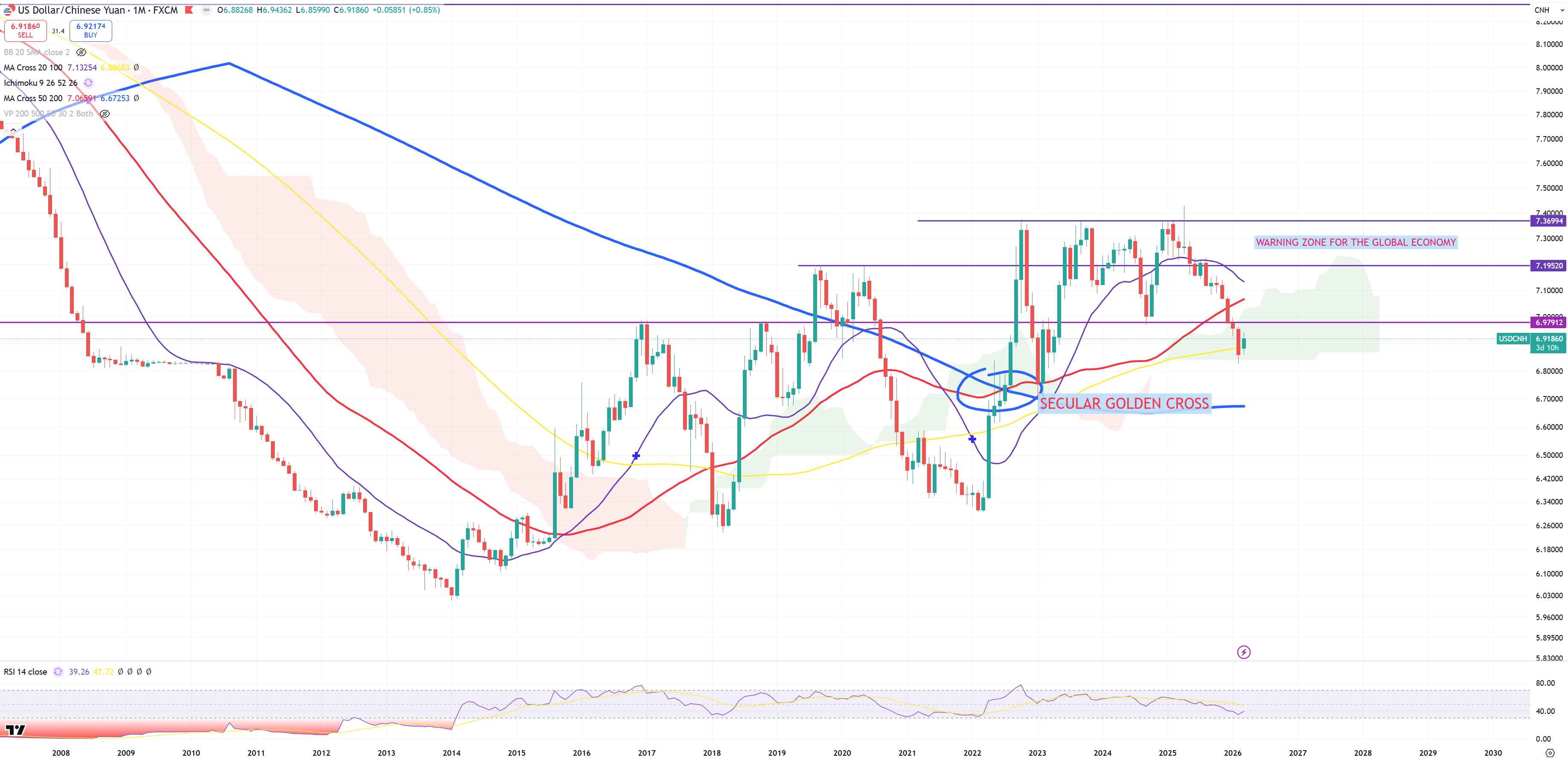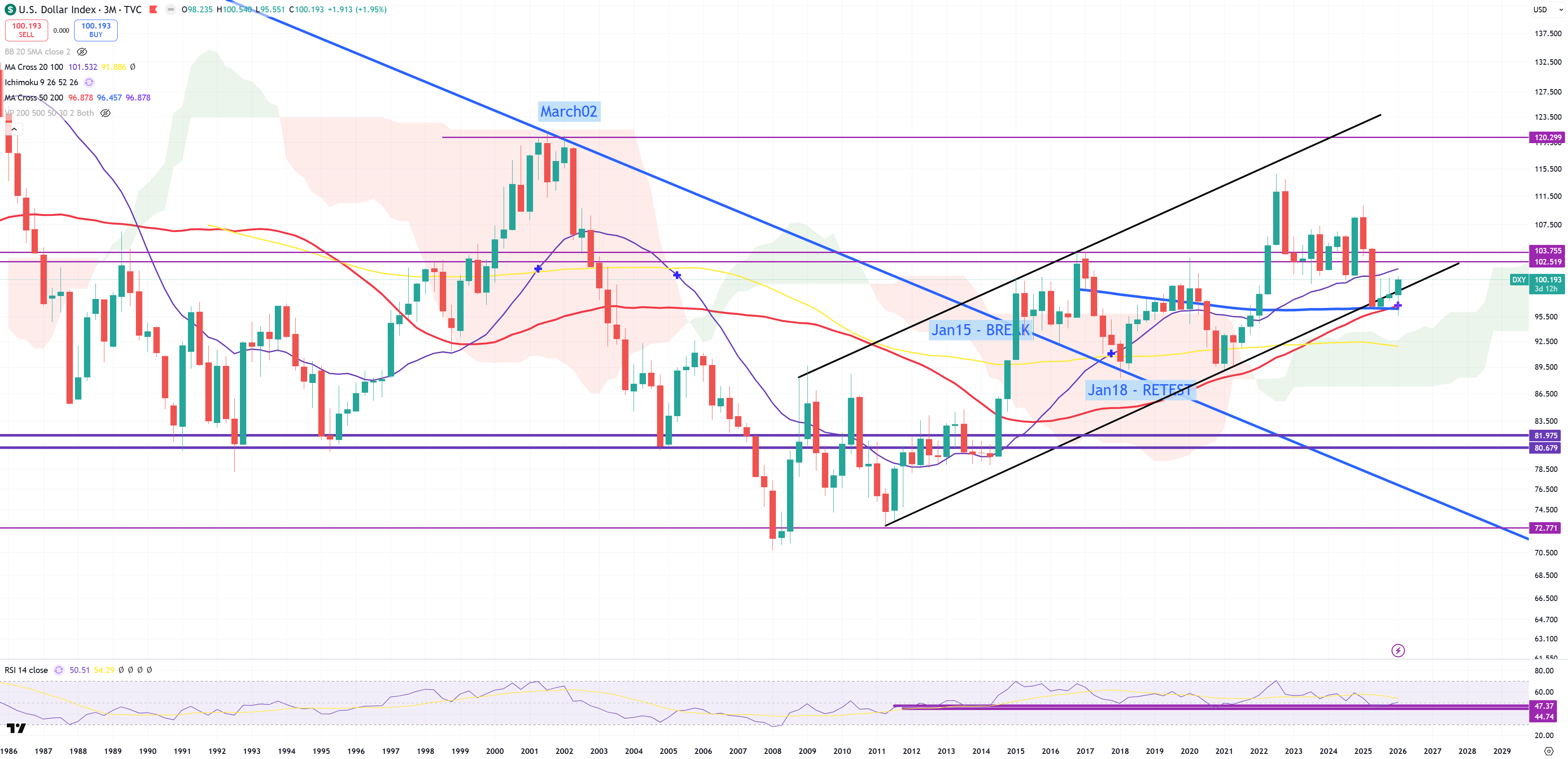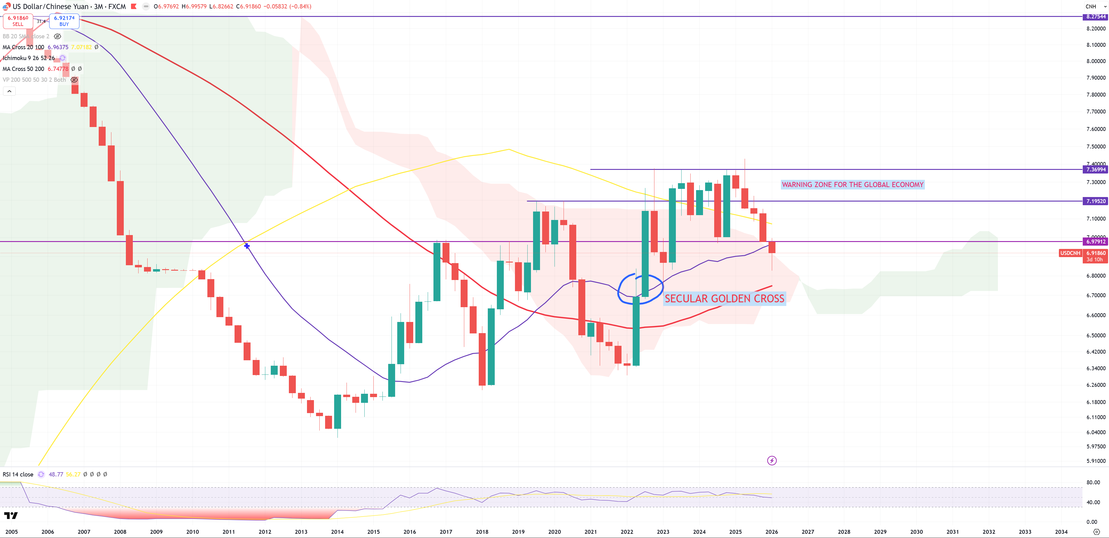 3 months later – not much changed, $$$ still reversing, Yuan still trying to find its peak (or USDCNH finds its bottom). So far on (M) view like above we see yellow (M)MA100 -> typical border of a bull/bear trap – this time bear trap. On 3M we see violet (3M)MA20, still 2 days left to close (M) candles for March 2026.