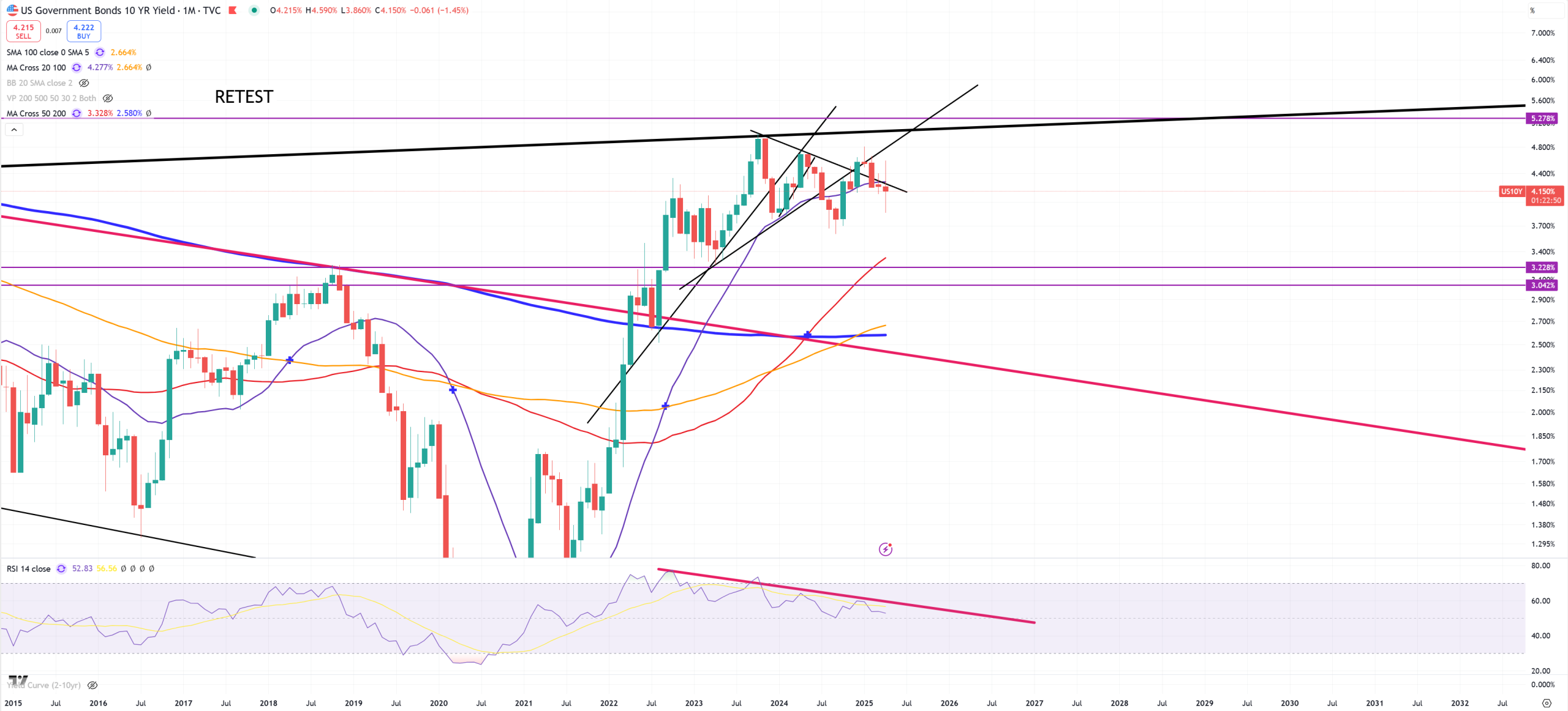 US10Y – detailed view shows back below the trend + below (M)MA20, but larger long term view shows : if that’s a retest you’ll not see 5% on US10Y for a long time