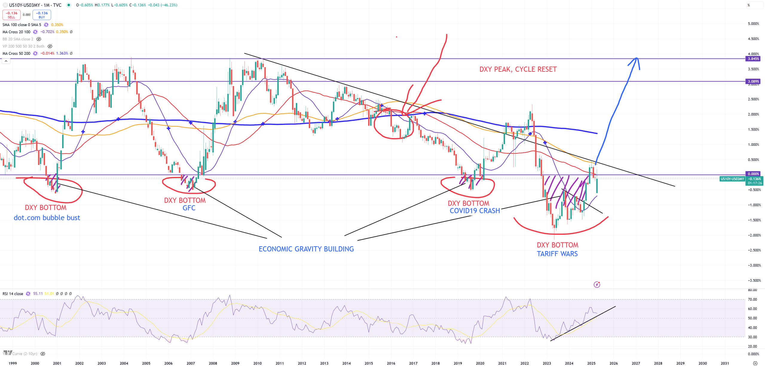 US10Y-US03MY – lagging 10Y-2Y by almost 70bps what is enormous level. Below (M)MA50 with positive divergence and the question when it’ll start chasing 10Y-2Y. As long as it’s not coming out fast from inversion, stock market will be dancing, because we can simplify that : when this pair is UP post inversion, the $$$ is going higher. Market is finished when this spread jumped finally post +50-60bps (so joining 10Y-2Y).