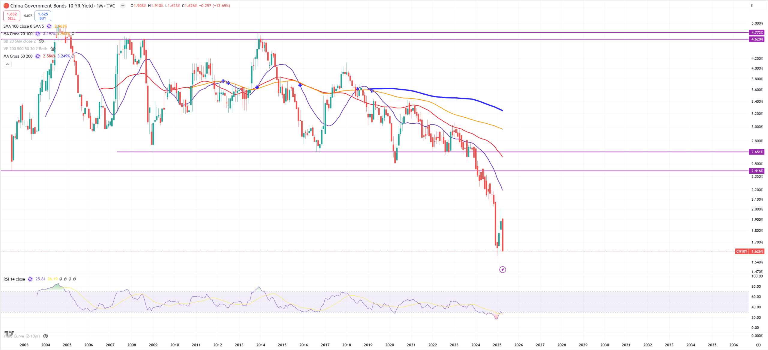 CN10Y – look on RSI. I think at some point of time we’ll start to see a flip. CN10Y will start going up while US10Y will start going down. That’ll be the same problem like Japan so economy is going to adjust the value of Yuan and trust in it.